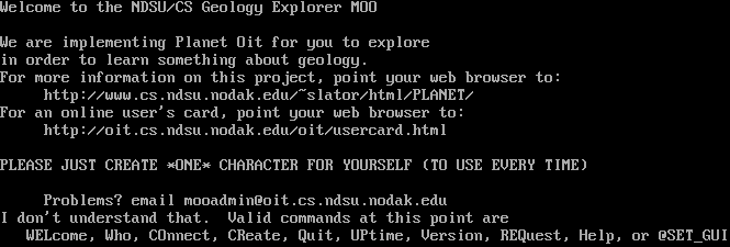 Welcome to the NDSU/CS Geology Explorer MOO We are implementing Planet Oit for you to explore in order to learn something about geology. For more information on this project, point your web browser to: http://www.cs.ndsu.nodak.edu/~slator/html/PLANET/ For an online user's card, point your web browser to: http://oit.cs.ndsu.nodak.edu/oit/usercard.html PLEASE JUST CREATE \*ONE\* CHARACTER FOR YOURSELF (TO USE EVERY TIME) Problems? email mooadmin@oit.cs.ndsu.nodak.edu I don't understand that. Valid commands at this point are WELcome, Who, COnnect, CReate, Quit, UPtime, Version, REQuest, Help, or @SET_GUI
