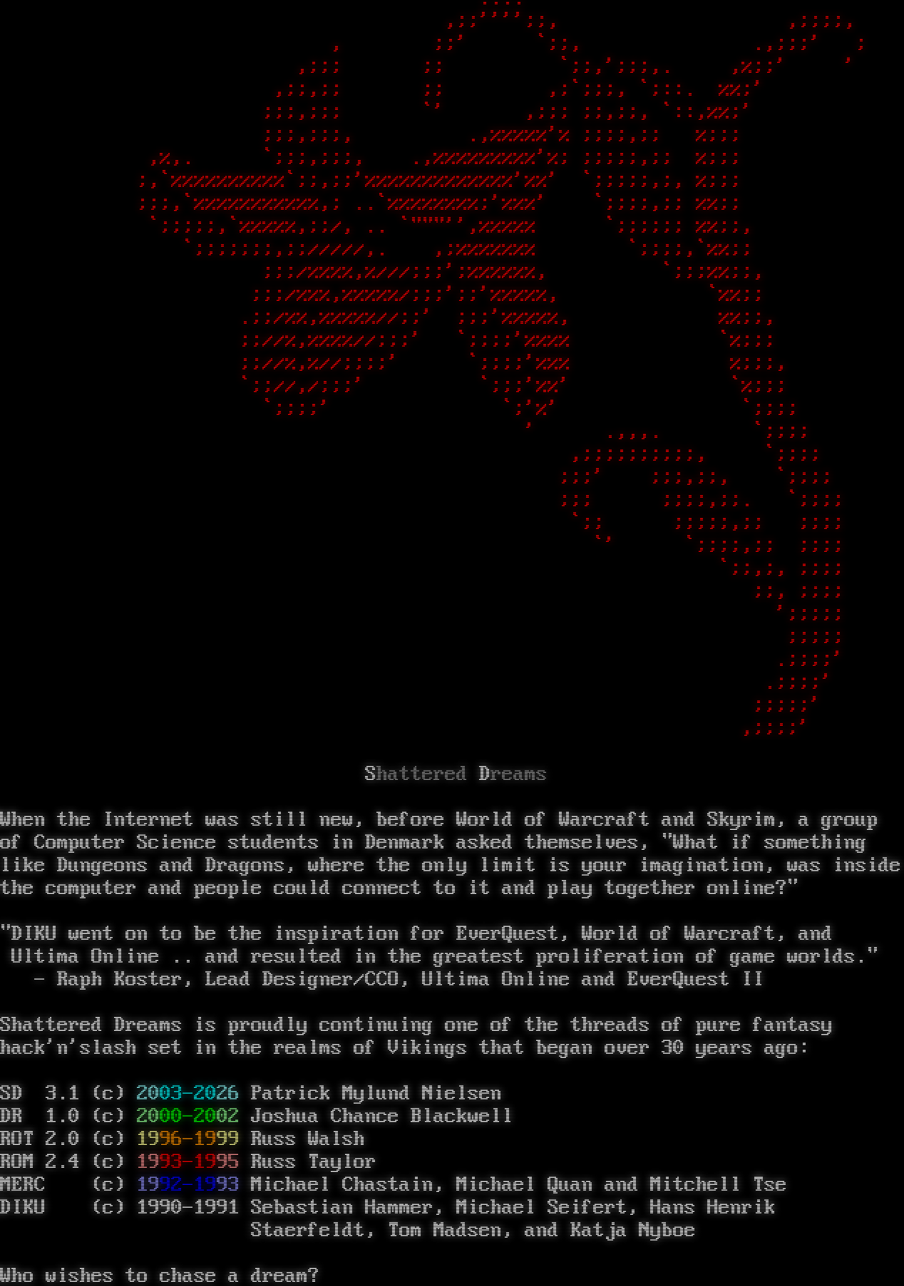 .​... ,;;'''';;, ,;;;;, , ;;' \`;;, .,;;;' ; ,;;; ;; \`;;,';;;,. ,%;;' ' ,;;,;; ;; ,;\`;;;, \`;::. %%;' ;;;,;;; \`' ,;;; ;;,;;, \`::,%%;' ;;;,;;;, .,%%%%%'% ;;;;,;; %;;; ,%,. \`;;;,;;;, .,%%%%%%%%%'%; ;;;;;,;; %;;; ;,\`%%%%%%%%%%\`;;,;;'%%%%%%%%%%%%%'%%' \`;;;;;,;, %;;; ;;;,\`%%%%%%%%%%%,; ..\`%%%%%%%%;'%%%' \`;;;;,;; %%;; \`;;;;;,\`%%%%%,;;/, .. \`"""'',%%%%% \`;;;;;; %%;;, \`;;;;;;;,;;/////,. ,;%%%%%%% \`;;;;,\`%%;; ;;;/%%%%,%///;;;';%%%%%%, \`;;;%%;;, ;;;/%%%,%%%%%/;;;';;'%%%%%, \`%%;; .;;/%%,%%%%%//;;' ;;;'%%%%%, %%;;, ;;//%,%%%%//;;;' \`;;;;'%%%% \`%;;; ;;//%,%//;;;;' \`;;;;'%%% %;;;, \`;;//,/;;;' \`;;;'%%' \`%;;; \`;;;;' \`;'%' \`;;;; ' .,,,. \`;;;; ,;;;;;;;;;;, \`;;;; ;;;' ;;;,;;, \`;;;; ;;; ;;;;,;;. \`;;;; \`;; ;;;;;,;; ;;;; \`' \`;;;;,;; ;;;; \`;;,;, ;;;; ;;, ;;;; ';;;;; ;;;;; .;;;;' .;;;;' ;;;;;' ,;;;;' Shattered Dreams When the Internet was still new, before World of Warcraft and Skyrim, a group of Computer Science students in Denmark asked themselves, "What if something like Dungeons and Dragons, where the only limit is your imagination, was inside the computer and people could connect to it and play together online?" "DIKU went on to be the inspiration for EverQuest, World of Warcraft, and Ultima Online .. and resulted in the greatest proliferation of game worlds." - Raph Koster, Lead Designer/CCO, Ultima Online and EverQuest II Shattered Dreams is proudly continuing one of the threads of pure fantasy hack'n'slash set in the realms of Vikings that began over 30 years ago: SD 3.1 (c) 2003-2026 Patrick Mylund Nielsen DR 1.0 (c) 2000-2002 Joshua Chance Blackwell ROT 2.0 (c) 1996-1999 Russ Walsh ROM 2.4 (c) 1993-1995 Russ Taylor MERC (c) 1992-1993 Michael Chastain, Michael Quan and Mitchell Tse DIKU (c) 1990-1991 Sebastian Hammer, Michael Seifert, Hans Henrik Staerfeldt, Tom Madsen, and Katja Nyboe Who wishes to chase a dream?