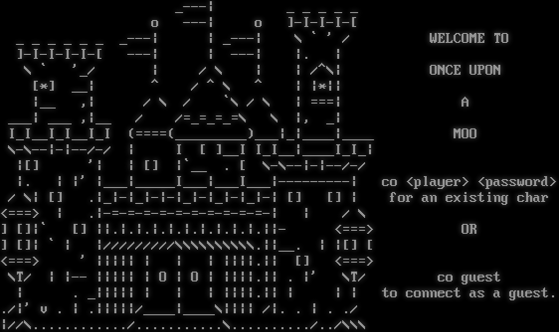_​---\| _ _ _ _ _ o ---\| o ]-I-I-I-[ _ _ _ _ _ _ _​---\| \| _​---\| \\ \` ' / WELCOME TO ]-I-I-I-I-[ ---\| \| ---\| \|. \| \\ \` '_/ \| / \\ \| \| /^\\\| ONCE UPON [\*] __\| ^ / ^ \\ ^ \| \|\*\|\| \|__ ,\| / \\ / \`\\ / \\ \| ===\| A ___\| ___ ,\|__ / /=​_=_=_=\\ \\ \|, _\| I_I__I_I__I_I (=​===(_​________)___\|_\|_​___\|_​___ MOO \\-\\--\|-\|--/-/ \| I [ ]__I I_I__\|_​___I_I_\| \|[] '\| \| [] \|\`__ . [ \\-\\--\|-\|--/-/ \|. \| \|' \|___\|_​____I___\|___I___\|-​--------\| co <player> <password> / \\\| [] .\|_\|-\|_\|-\|-\|_\|-\|_\|-\|_\|-\| [] [] \| for an existing char <===> \| .\|-​=-=-=-=-=-=-=-=-=-=-\| \| / \\ ] []\|\` [] \|\|.\|.\|.\|.\|.\|.\|.\|.\|.\|.\|\|- <===> OR ] []\| \` \| \|/////////\\\\\\\\\\\\\\\\\\\\.\|\|__. \| \|[] [ <===> ' \|\|\|\|\| \| \| \| \|\|\|\|.\|\| [] <===> \\T/ \| \|-- \|\|\|\|\| \| O \| O \| \|\|\|\|.\|\| . \|' \\T/ co guest \| . _\|\|\|\|\| \| \| \| \|\|\|\|.\|\| \| \| \| to connect as a guest. ./\|' v . \| .\|\|\|\|\|/_​___\|_​___\\\|\|\|\| /\|. . \| . ./ \|//\\.​.........../.​..........\\.​........./../\\\\\\