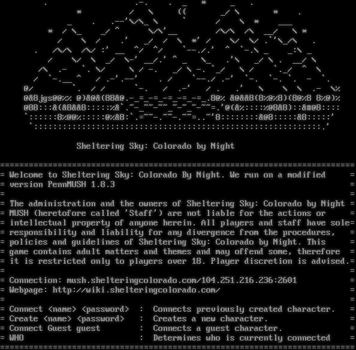 . .-. . _ \* _ . \* / \\ (( _/ \\ \* . _ . .--'\\/\\_ \\ \` / \\ \* ___ \* / \\_ _/ ^ \\/\\'__ /\\/\\ /\\ __/ \\ \* / \\ / .' _/ / \\ \*' / \\/ \\/ .\`'\\_/\\ . . /\\/\\ /\\/ :' __ ^/ ^/ \`--./.' ^ \`-.\\ _ _:\\ _ / \\/ \\ _/ \\-' __/.' ^ _ \\_ .'\\ _/ \\ . __/ \\ /\\ .- \`. \\/ \\ / -. _/ \\ -. \`_/ \\ / \`._/ ^ \\ / \`-​.__ ^ / .-'.--' . / \`--./ .-' \`-. \`-. \`. - \`. @/ \`. / / \`-. / .-' / . .' \\ \\ \\ .- \\% @&8jgs@@%% @)&@&(88&@.​-_=_-=_-=_-=_-=_.8@% &@&&8(8%@%8)(8@%8 8%@)% @88:::&(&8&&8:::::%&\`.​~-_~~-~~_~-~_~-~~=.'@(&%::::%@8&8)::&#@8:::: \`::::::8%@@%:::::@%&8:\`.​=~~-.~~-.~~=..~'8::::::::&@8:::::&8:::::' \`::::::::::::::::::::::::::::::::::::::::::::::::::::::::::::.' Sheltering Sky: Colorado by Night =​========================================================================= = Welcome to Sheltering Sky: Colorado By Night. We run on a modified = = version PennMUSH 1.8.3 = = = = The administration and the owners of Sheltering Sky: Colorado by Night = = MUSH (heretofore called 'Staff') are not liable for the actions or = = intellectual property of anyone herein. All players and staff have sole= = responsibility and liability for any divergence from the procedures, = = policies and guidelines of Sheltering Sky: Colorado by Night. This = = game contains adult matters and themes and may offend some, therefore = = it is restricted only to players over 18. Player discretion is advised.= = = = Connection: mush.shelteringcolorado.com/104.251.216.236:2601 = = Webpage: http://wiki.shelteringcolorado.com/ = = = = Connect <name> <password> : Connects previously created character. = = Create <name> <password> : Creates a new character. = = Connect Guest guest : Connects a guest character. = = WHO : Determines who is currently connected = =​=========================================================================