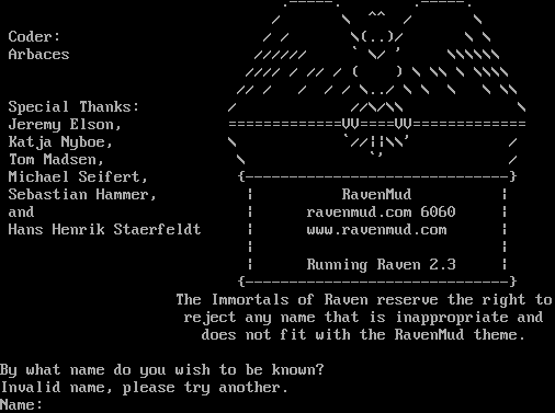 .​-----. .​-----. / \\ ^^ / \\ Coder: / / \\(..)/ \\ \\ Arbaces ////// \` \\/ ' \\\\\\\\\\\\ //// / // / ( ) \\ \\\\ \\ \\\\\\\\ // / / / / \\../ \\ \\ \\ \\ \\\\ Special Thanks: / //\\/\\\\ \\ Jeremy Elson, =​============VV=​===VV=​============ Katja Nyboe, \\ \`//\|\|\\\\' / Tom Madsen, \\ \`' / Michael Seifert, {-​-----------------------------} Sebastian Hammer, \| RavenMud \| and \| ravenmud.com 6060 \| Hans Henrik Staerfeldt \| www.ravenmud.com \| \| \| \| Running Raven 2.3 \| {-​-----------------------------} The Immortals of Raven reserve the right to reject any name that is inappropriate and does not fit with the RavenMud theme. By what name do you wish to be known? Invalid name, please try another. Name:
