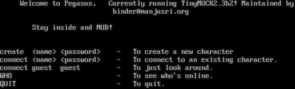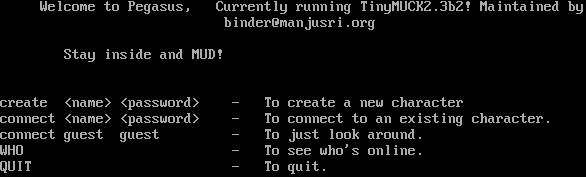 Welcome to Pegasus, Currently running TinyMUCK2.3b2! Maintained by binder@manjusri.org Stay inside and MUD! create <name> <password> - To create a new character connect <name> <password> - To connect to an existing character. connect guest guest - To just look around. WHO - To see who's online. QUIT - To quit.