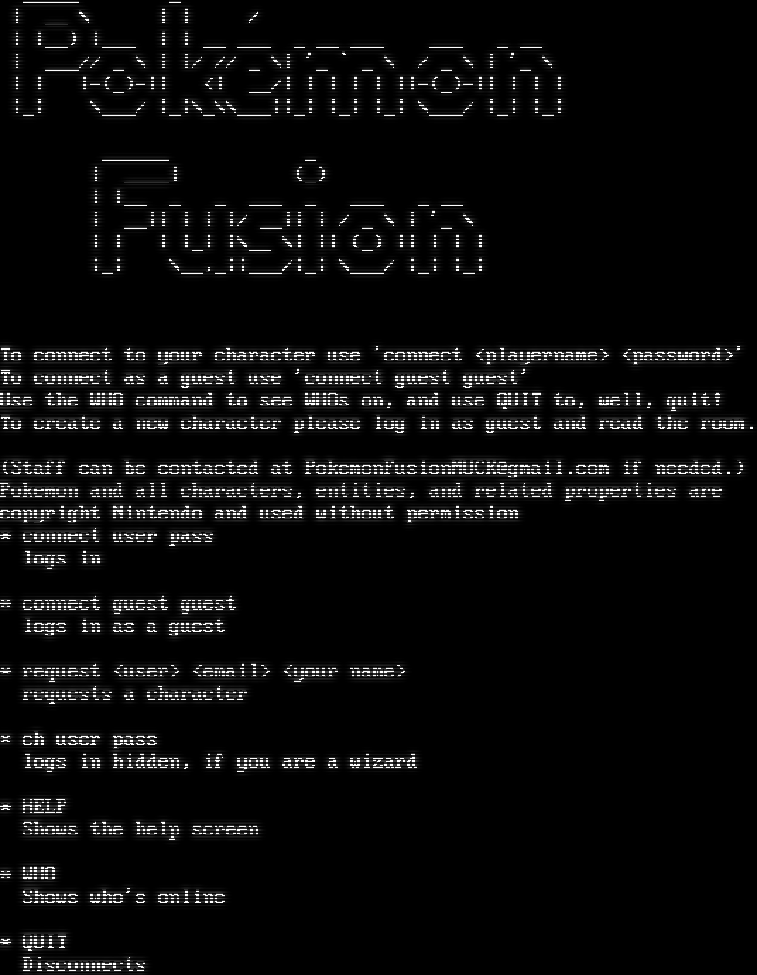 _​____ _ \| __ \\ \| \| / \| \|__) \|___ \| \| __ ___ _ __ ___ ___ _ __ \| ___// _ \\ \| \|/ // _ \\\| '_ \` _ \\ / _ \\ \| '_ \\ \| \| \|-(_)-\|\| <\| __/\| \| \| \| \| \|\|-(_)-\|\| \| \| \| \|_\| \\___/ \|_\|\\_\\\\___\|\|_\| \|_\| \|_\| \\___/ \|_\| \|_\| _​_____ _ \| _​___\| (_) \| \|__ _ _ ___ _ ___ _ __ \| __\|\| \| \| \|/ __\|\| \| / _ \\ \| '_ \\ \| \| \| \|_\| \|\\__ \\\| \|\| (_) \|\| \| \| \| \|_\| \\__,_\|\|___/\|_\| \\___/ \|_\| \|_\| To connect to your character use 'connect <playername> <password>' To connect as a guest use 'connect guest guest' Use the WHO command to see WHOs on, and use QUIT to, well, quit! To create a new character please log in as guest and read the room. (Staff can be contacted at PokemonFusionMUCK@gmail.com if needed.) Pokemon and all characters, entities, and related properties are copyright Nintendo and used without permission \* connect user pass logs in \* connect guest guest logs in as a guest \* request <user> <email> <your name> requests a character \* ch user pass logs in hidden, if you are a wizard \* HELP Shows the help screen \* WHO Shows who's online \* QUIT Disconnects