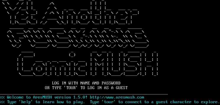 __ __ _ _ _ \\ \\ / / \| \| /\\ \| \| \| \| \\ \\_/ /__\| \|_ / \\ _ __ ___ \| \|_\| \|__ ___ _ __ \\ / _ \\ __\| / /\\ \\ \| '_ \\ / _ \\\| __\| '_ \\ / _ \\ '__\| \| \| __/ \|_ / _​___ \\\| \| \| \| (_) \| \|_\| \| \| \| __/ \| \|_\|\\___\|\\__\| /_/ \\_\\_\| \|_\|\\___/ \\__\|_\| \|_\|\\___\|_\| _​_____ __ __ _​_____ __ __ __ __ __ _​_____ /\\ ___\\/\\ \\/\\ \\ /\\ ___\\ /\\ \\/ / /\\ \\ /\\ "-.\\ \\ /\\ ___\\ \\ \\ __\\\\ \\ \\_\\ \\\\ \\ \\_​___\\ \\ _​"-.\\ \\ \\\\ \\ \\-. \\\\ \\ \\__ \\ \\ \\_\\ \\ \\_​____\\\\ \\_​____\\\\ \\_\\ \\_\\\\ \\_\\\\ \\_\\\\"\\_\\\\ \\_​____\\ \\/_/ \\/_​____/ \\/_​____/ \\/_/\\/_/ \\/_/ \\/_/ \\/_/ \\/_​____/ _​____ _ __ __ _ _ _​____ _ _ / _​___\| (_) \| \\/ \| \| \| \|/ _​___\| \| \| \| \| \| ___ _ __ ___ _ ___ \| \\ / \| \| \| \| (___ \| \|__\| \| \| \| / _ \\\| '_ \` _ \\\| \|/ __\| \| \|\\/\| \| \| \| \|\\___ \\\| __ \| \| \|___\| (_) \| \| \| \| \| \| \| (__ \| \| \| \| \|__\| \|_​___) \| \| \| \| \\_​____\\___/\|_\| \|_\| \|_\|_\|\\___\| \|_\| \|_\|\\_​___/\|_​____/\|_\| \|_\| LOG IN WITH NAME AND PASSWORD OR TYPE 'TOUR' TO LOG IN AS A GUEST _​______________________________________________________________________ %% Welcome to AresMUSH version 1.5.0! http://www.aresmush.com %% Type 'help' to learn how to play. Type 'tour' to connect to a guest character to explore.