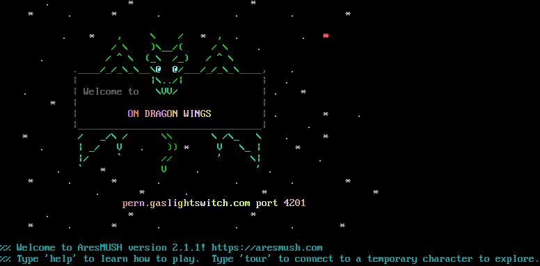 . \* \* \* . \* . . . \* . \* , \\ / \* , . . \* / \\ )\\__/( / \\ . . / ^ \\ (_\\ /_) / ^ \\ .​____/_/_\\_\\__\\@ @/___/_/_\\_\\_​___, . \| \|\\../\| \| . . \| Welcome to \\VV/ \| . \* \* \| \| \| ON DRAGON WINGS \| . \* . \|_​________________________________\| . \* / _/\\ / \\\\ \\ /\\_ \\ . \* . \| _/ V . )) \* V \\_ \| \* \|/ \` // ' \\\| . . \` \* V . ' . \* . \* . . . \* . \* . \* \* pern.gaslightswitch.com port 4201 . \* \* \* . \* . . . \* %% Welcome to AresMUSH version 2.1.1! https://aresmush.com %% Type 'help' to learn how to play. Type 'tour' to connect to a temporary character to explore.