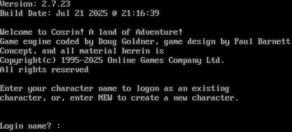 Version: 2.7.23 Build Date: Jul 21 2025 @ 21:16:39 Welcome to Cosrin! A land of Adventure! Game engine coded by Doug Goldner, game design by Paul Barnett Concept, and all material herein is Copyright(c) 1995-2025 Online Games Company Ltd. All rights reserved Enter your character name to logon as an existing character, or, enter NEW to create a new character. Login name? : <!el rvnum flag="RoomNum" tag="20"><!el rname flag="RoomName"><!el rdesc flag="RoomDesc"><!el rexit '<send "&text;\|glance &text;" hint="Exit Menu\|Move &text;\|Glance &text;" expire="move">' flag="RoomExit"><!el rshop '<send "buy &item;\|describe &item;" hint="Shop Menu\|Buy &text;\|Describe &text;" expire="move">' att="item"><!el rsign '<send "read sign" expire="move">'><!el rshow '<send "&text;" expire="move">'><!el shstable '<send "show stables" >'><!el shquest '<send "show quests" >'><!el shpsell '<send "show items" >'><!el shpspell '<send "show spells">'><!el shpskill '<send "show skills">'><!el shpserv '<send "show services">'><!tag 20 gag><!ELEMENT Prompt FLAG='Prompt'><!ELEMENT Hp FLAG='Set hp'><!ELEMENT MaxHp FLAG='Set maxhp'><!ELEMENT Sp FLAG='Set mana'><!ELEMENT MaxSp FLAG='Set maxmana'><!ELEMENT Get "<send href='get &#39;&name;&#39;\|examine &#39;&name;&#39;\|drink &#39;&name;&#39;' hint='RH mouse click to use this object\|Get &desc;\|Examine &desc;\|Drink from &desc;'>" ATT='name desc'><!ELEMENT Drop "<send href='drop &#39;&name;&#39;\|examine &#39;&name;&#39;\|look in &#39;&name;&#39;\|wear &#39;&name;&#39;\|eat &#39;&name;&#39;\|drink &#39;&name;&#39;' hint='RH mouse click to use this object\|Drop &desc;\|Examine &desc;\|Look inside &desc;\|Wear &desc;\|Eat &desc;\|Drink &desc;'>" ATT='name desc'><!ELEMENT Bid "<send href='bid &#39;&name;&#39;' hint='Bid for &desc;'>" ATT='name desc'><!ELEMENT List "<send href='buy &#39;&name;&#39;' hint='Buy &desc;'>" ATT='name desc'><!ELEMENT Player "<send href='tell &#39;&name;&#39; ' hint='Send a message to &name;' prompt>" ATT='name'>
