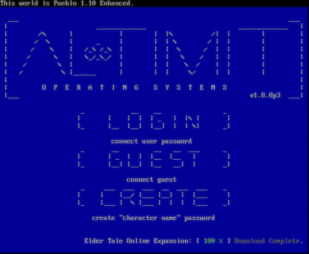 This world is Pueblo 1.10 Enhanced. ___ ___ \| _​____________ _​____________ \| \| /\\ \| \| \| \|\\ /\| \| \| \| \| / \\ \| _ \| \| \| \\ / \| \| \| \| \| / \\ \| /_\\ /_\\ \| \| \| \\ / \| \| \| \| \| / \\ \| \\_/_\\_/ \| \| \| \\ / \| \| \| \| \| / \\ \| \| \| \| \\ / \| \| \| \| \| / \\ \|_​_____ \| \| \| \\/ \| \| \| \| \| \| \| O P E R A T I N G S Y S T E M S \| \|___ v1.8.8p3 ___\| _ __ __ _ \| \| \| \| \| _ \| \|\\ \| \| \|_ \|__ \|__\| \|__\| \| \| \\\| _\| connect user password _ __ __ __ ___ _ \| \| _ \| \| \|__ \|__ \| \| \|_ \|__\| \|__\| \|__ __\| \| _\| connect guest _ ___ ___ ___ __ ___ ___ _ \| \| \|__/ \|___ \|__\| \| \|___ \| \|_ \|___ \| \\ \|___ \| \| \| \|___ _\| create "character name" password Elder Tale Online Expansion: [ 100 % ] Download Complete.