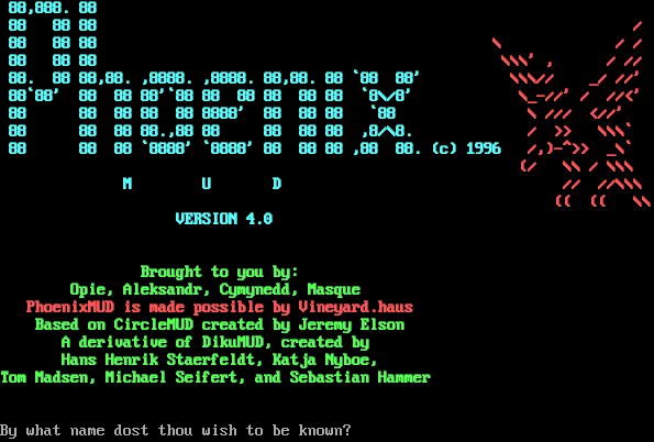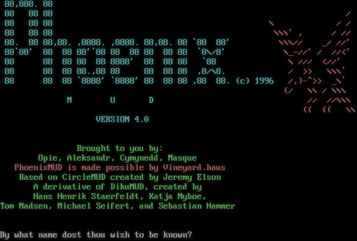 88,888. 88 88 88 88 / 88 88 88 \\ / / 88 88 88 \\\\\\' , / // 88. 88 88,88. ,8888. ,8888. 88,88. 88 \`88 88' \\\\\\// _/ //' 88\`88' 88 88 88'\`88 88 88 88 88 88 \`8\\/8' \\_-//' / //<' 88 88 88 88 88 8888' 88 88 88 \`88 \\ /// <//' 88 88 88 88.,88 88 88 88 88 ,8/\\8. / >> \\\\\\\` 88 88 88 \`8888' \`8888' 88 88 88 ,88 88. (c) 1996 /,)-^>> _\\\` (/ \\\\ / \\\\\\ M U D // //\\\\\\ (( (( \\\\ VERSION 4.0 Brought to you by: Opie, Aleksandr, Cymynedd, Masque PhoenixMUD is made possible by Vineyard.haus Based on CircleMUD created by Jeremy Elson A derivative of DikuMUD, created by Hans Henrik Staerfeldt, Katja Nyboe, Tom Madsen, Michael Seifert, and Sebastian Hammer Please wait By what name dost thou wish to be known?