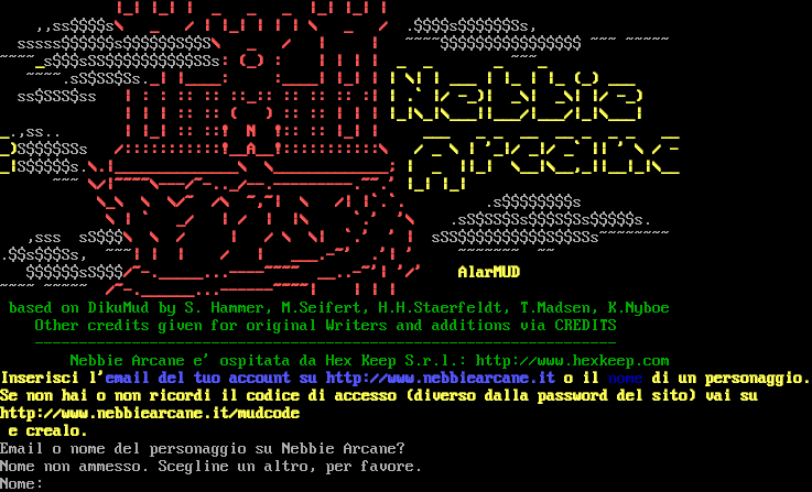 \|_\| \|_\| \| _ _ _ \|_\| \|_\| \| ,,ss$$$$s\\ _ / \| \|_\| \| \| \| \\ _ / .$$$$s$$$$$$Ss, sssss$$$$$$s$$$$$$S$$S\\ _ / \| \| ~​~~~$$$$$$$$$$$$$$$$ ~~~ ~​~~~~ $$$s$$$sSS$$$$$$$$$$SSs: (_) : \| \| \| \| _ _ _ ~​~~_ [0;37m~​~~~_ ~​~~~.sS$SS$Ss._\| \|_​___: :_​___\| \|_\| \| \| \\\| \| ___ \| \|_ \| \|_ (_) ___ ss$SSS$ss \| : : :: :: ::_:: :: :: :: :\| \| .\` \|/ -_)\| _\\\| _\\\| \|/ -_) \| \| \| :: :: ( ) :: :: \| \| \| \|_\|\\_\|\\___\|\|___/\|___/\|_\|\\___\| .,ss.. \| \|_\| :: ::! N !:: :: \|_\| \| ___ _ _ __ __ _ _ _ __ _ sSS$$$$SSs /:::::::::::!__A__!:::::::::::\\ / _ \\ \| '_\|/ _\|/ _\` \|\| ' \\ / - _) S$$$$$s.\\.\|_​_____________\\ \\_​____________; \| _ \|\|_\| \\__\|\\__,_\|\|__\|_\|\\__ _\| ~~~ \\/\|~​~~~\\---/~​-.._/-​-.---------.~~.' \|_\| \|_\| \\_\\ \\ \\/~ /\\ ~,~\| \\ /\| \|\`.\`. .s$$$$$$$$s \\ \| \` _/ \| / \| \|\\ \`.' '\\ .sS$SS$Ss$$$S$Ss$$$$$s. ,sss sS$$$\\ \\ / \| / \\ \\\| \`.' ' \| sSS$$$$$$$$$$S$$SSs~​~~~~~~~ .$$s$$$Ss, ~~~\| \| \| / \| _​__.-~' .'\| ' ~​~~~~~~ ~~ $$$$$$sS$$$/~​-._____...----~~~~ _​_..-~'\| '/' AlarMUD ~​~~~ ~​~~~~ /~​-.______...------~~~~\| \| \| \| based on DikuMud by S. Hammer, M.Seifert, H.H.Staerfeldt, T.Madsen, K.Nyboe Other credits given for original Writers and additions via CREDITS -​----------------------------------------------------------------- Nebbie Arcane e' ospitata da Hex Keep S.r.l.: http://www.hexkeep.com Inserisci l'email del tuo account su http://www.nebbiearcane.it o il nome di un personaggio. Se non hai o non ricordi il codice di accesso (diverso dalla password del sito) vai su http://www.nebbiearcane.it/mudcode e crealo. Email o nome del personaggio su Nebbie Arcane? Nome non ammesso. Scegline un altro, per favore. Nome: