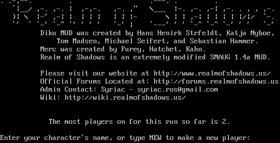 . .-,--. . .​---. . . \`\|__/ ,-. ,-. \| ,-,-. ,-. ," \\___ \|-. ,-. ,-\| ,-. . , , ,-. )\| \\ \|-' ,-\| \| \| \| \| \| \| \|- \\ \| \| ,-\| \| \| \| \| \|/\|/ \`-. \`' \` \`-' \`-^ \`' ' ' ' \`-' \| \`---' ' ' \`-^ \`-^ \`-' ' ' \`-' Diku MUD was created by Hans Henirk Strfeldt, Katja Nyboe, Tom Madsen, Michael Seifert, and Sebastian Hammer. Merc was created by Furey, Hatchet, Kahn. Realm of Shadows is an extremely modified SMAUG 1.4a MUD. Please visit our website at http://www.realmofshadows.us/ Official Forums Located at: http://forums.realmofshadows.us Admin Contact: Syriac - syriac.ros@gmail.com Wiki: http://wiki.realmofshadows.us/ The most players on for this run so far is 2. Enter your character's name, or type NEW to make a new player: