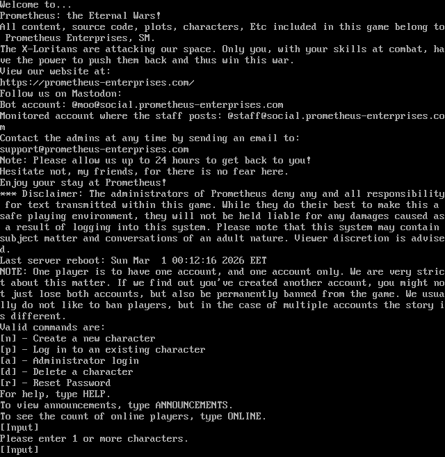 Welcome to... Prometheus: the Eternal Wars! All content, source code, plots, characters, Etc included in this game belong to Prometheus Enterprises, SM. The X-Loritans are attacking our space. Only you, with your skills at combat, have the power to push them back and thus win this war. View our website at: https://prometheus-enterprises.com/ Follow us on Mastodon: Bot account: @moo@social.prometheus-enterprises.com Monitored account where the staff posts: @staff@social.prometheus-enterprises.com Contact the admins at any time by sending an email to: support@prometheus-enterprises.com Note: Please allow us up to 24 hours to get back to you! Hesitate not, my friends, for there is no fear here. Enjoy your stay at Prometheus! \*\*\* Disclaimer: The administrators of Prometheus deny any and all responsibility for text transmitted within this game. While they do their best to make this a safe playing environment, they will not be held liable for any damages caused as a result of logging into this system. Please note that this system may contain subject matter and conversations of an adult nature. Viewer discretion is advised. Last server reboot: Sun Mar 1 00:12:16 2026 EET NOTE: One player is to have one account, and one account only. We are very strict about this matter. If we find out you've created another account, you might not just lose both accounts, but also be permanently banned from the game. We usually do not like to ban players, but in the case of multiple accounts the story is different. Valid commands are: [n] - Create a new character [p] - Log in to an existing character [a] - Administrator login [d] - Delete a character [r] - Reset Password For help, type HELP. To view announcements, type ANNOUNCEMENTS. To see the count of online players, type ONLINE. [Input] Please enter 1 or more characters. [Input]