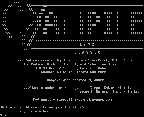 . oOO oo OO OO\*\*\*\*\*\*oo\*\*\*\*\*\*\*\*\*\*\*\*\*\*\*\*\*\*\*\*\*\*\*\*\*\*\*\*\*\*\*\*\*\*\*\*\*\*\*\*\*\*\*\*\*\*\*\*\* oo OO OO oo oo OO OO oo OO OO OO OOOO OOOO OOOO OOOOOO oo OO OO OO OO OOO OOO OO OO OO OO OO OO oo OO ooOO OO OO OO OO OO OO OO OO OO OO OO OOOOOO oo OO oo OO OOOOOO OO OO OO OO OOOO OO OOOO OO oo OOoo OO OO OO OO OO OO OO OO OO OO OO OO oo oOO OO OO OO OO OOO OO OO OOOO OO OO OOOOOO oo oo OO OO ooo OO OO \*\*\*\*\*\*\*\*\*\*\*\*\*\*\*\*\*\*\*\*\*\*\*\*\*\*\*\*\*\*\*\*\*\*\*\*\*\*\*\*\*\*\*\*\*\*\*\*\*\*\*\*\*\*\* oo OO OO W A R S OO \*\*\*\*\*\*\*\*\*\*\*\*\*\*\*\*\*\*\*\*\*\*\*\*\*\*\*\*\*\*\*\*\*\*\*\*\*\*\*\*\*\*\*\*\*\*\*\*\*\*\*\*\*\*\*\*\* C L A S S I C Diku Mud was created by Hans Henrick Staerfeldt, Katja Nyboe, Tom Madsen, Michael Seifert, and Sebastian Hammer. 1/8/93 Merc 2.1 Furey, Hatchet, Kahn. Godwars by KaVir/Richard Woolcock. Vampire Wars created by Joker. VW:Classic coded and run by: Dirge, Ember, Kismet, Azazel, Helmut, Mute, Netosia. Mud email - support@new.vampire-wars.com What name would you like on your tombstone? Illegal name, try another. Name: