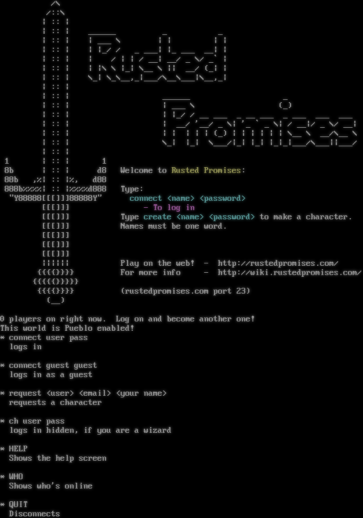 /\\ /::\\ \| :: \| \| :: \| _​_____ _ _ \| :: \| \| ___ \\ \| \| \| \| \| :: \| \| \|_/ / _ ___\| \|_ ___ __\| \| \| :: \| \| / \| \| / __\| __/ _ \\/ _\` \| \| :: \| \| \|\\ \\ \|_\| \\__ \\ \|\| __/ (_\| \| \| :: \| \\_\| \\_\\__,_\|___/\\__\\___\|\\__,_\| \| :: \| \| :: \| _​_____ _ \| :: \| \| ___ \\ (_) \| :: \| \| \|_/ / __ ___ _ __ ___ _ ___ ___ ___ \| :: \| \| __/ '__/ _ \\\| '_ \` _ \\\| / __\|/ _ \\/ __\| \| :: \| \| \| \| \| \| (_) \| \| \| \| \| \| \\__ \\ __/\\__ \\ \| :: \| \\_\| \|_\| \\___/\|_\| \|_\| \|_\|_\|___/\\___\|\|___/ \| :: \| 1 \| :: \| 1 8b \| :: \| d8 Welcome to Rusted Promises: 88b ,%\| :: \|%, d88 888b%%%%\| :: \|%%%%d888 Type: "Y88888[[[]]]88888Y" connect <name> <password> [[[]]] - To log in [[[]]] Type create <name> <password> to make a character. [[[]]] Names must be one word. [[[]]] [[[]]] [[[]]] \|\|\|\|\|\| Play on the web! - http://rustedpromises.com/ {{{{}}}} For more info - http://wiki.rustedpromises.com/ {{{{{}}}}} {{{{}}}} (rustedpromises.com port 23) (__) 0 players on right now. Log on and become another one! This world is Pueblo enabled! \* connect user pass logs in \* connect guest guest logs in as a guest \* request <user> <email> <your name> requests a character \* ch user pass logs in hidden, if you are a wizard \* HELP Shows the help screen \* WHO Shows who's online \* QUIT Disconnects