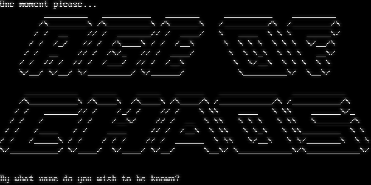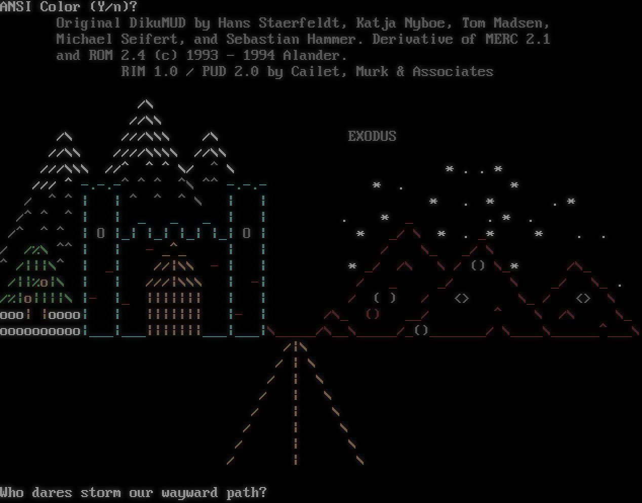 ANSI Color (Y/n)? Original DikuMUD by Hans Staerfeldt, Katja Nyboe, Tom Madsen, Michael Seifert, and Sebastian Hammer. Derivative of MERC 2.1 and ROM 2.4 (c) 1993 - 1994 Alander. RIM 1.0 / PUD 2.0 by Cailet, Murk & Associates /\\ //\\\\ /\\ ///\\\\\\ /\\ EXODUS //\\\\ ////\\\\\\\\ //\\\\ ///\\\\\\ //^ ^ ^ \\/ ^ \\ \* . . \* /// ^ -​.-.-^ ^ ^ ^\\ ^^ -​.-.- \* . \* / ^ ^ \| \| ^ ^ ^ \\ \| \| \* . \* . \* /^ ^ ^ \| \| _ _ _ \| \| . \* _ . \* . /^ ^ ^ \| O \|_\| \|_\| \|_\| \|_\| O \| \* _/ \\ \* . _\* \* . . / /%\\ ^^ \| \| - _^_ \| \| / \\_ _/ \\ ^ /\|\|\|\\^ \| _\| //\|\\\\ - \| \| \* _/ /\\ \\ / () \\_\* /\\_ /\|\|%o\|\\ \| \| ///\|\\\\\\ \| -\| / _ _/ \\ _/ \\_ . /%\|o\|\|\|\|\\ \|- \|_ \|\|\|\|\|\|\| \| \| / ( ) / <> \\_ / <> \\ ooo\| \|oooo\| \| \|\|\|\|\|\|\| \|- \| /\\_ () __/ ^ \\ /\\ \\_ oooooooooo\|___\|___\|\|\|\|\|\|\|___\|___\|\\_​____/\\__\\_​____/_()_​______/ \\_​___\\_​_____^___\\ /\|\\ / \| \\ / \| \\ / \| \\ / \| \\ / \| \\ / \| \\ / \| \\ Who dares storm our wayward path?