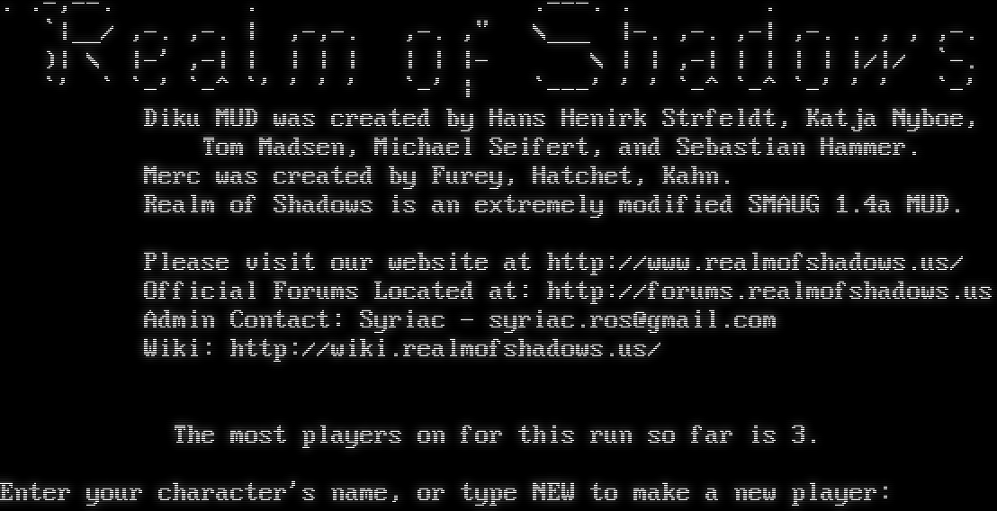 . .-,--. . .​---. . . \`\|__/ ,-. ,-. \| ,-,-. ,-. ," \\___ \|-. ,-. ,-\| ,-. . , , ,-. )\| \\ \|-' ,-\| \| \| \| \| \| \| \|- \\ \| \| ,-\| \| \| \| \| \|/\|/ \`-. \`' \` \`-' \`-^ \`' ' ' ' \`-' \| \`---' ' ' \`-^ \`-^ \`-' ' ' \`-' Diku MUD was created by Hans Henirk Strfeldt, Katja Nyboe, Tom Madsen, Michael Seifert, and Sebastian Hammer. Merc was created by Furey, Hatchet, Kahn. Realm of Shadows is an extremely modified SMAUG 1.4a MUD. Please visit our website at http://www.realmofshadows.us/ Official Forums Located at: http://forums.realmofshadows.us Admin Contact: Syriac - syriac.ros@gmail.com Wiki: http://wiki.realmofshadows.us/ The most players on for this run so far is 3. Enter your character's name, or type NEW to make a new player: