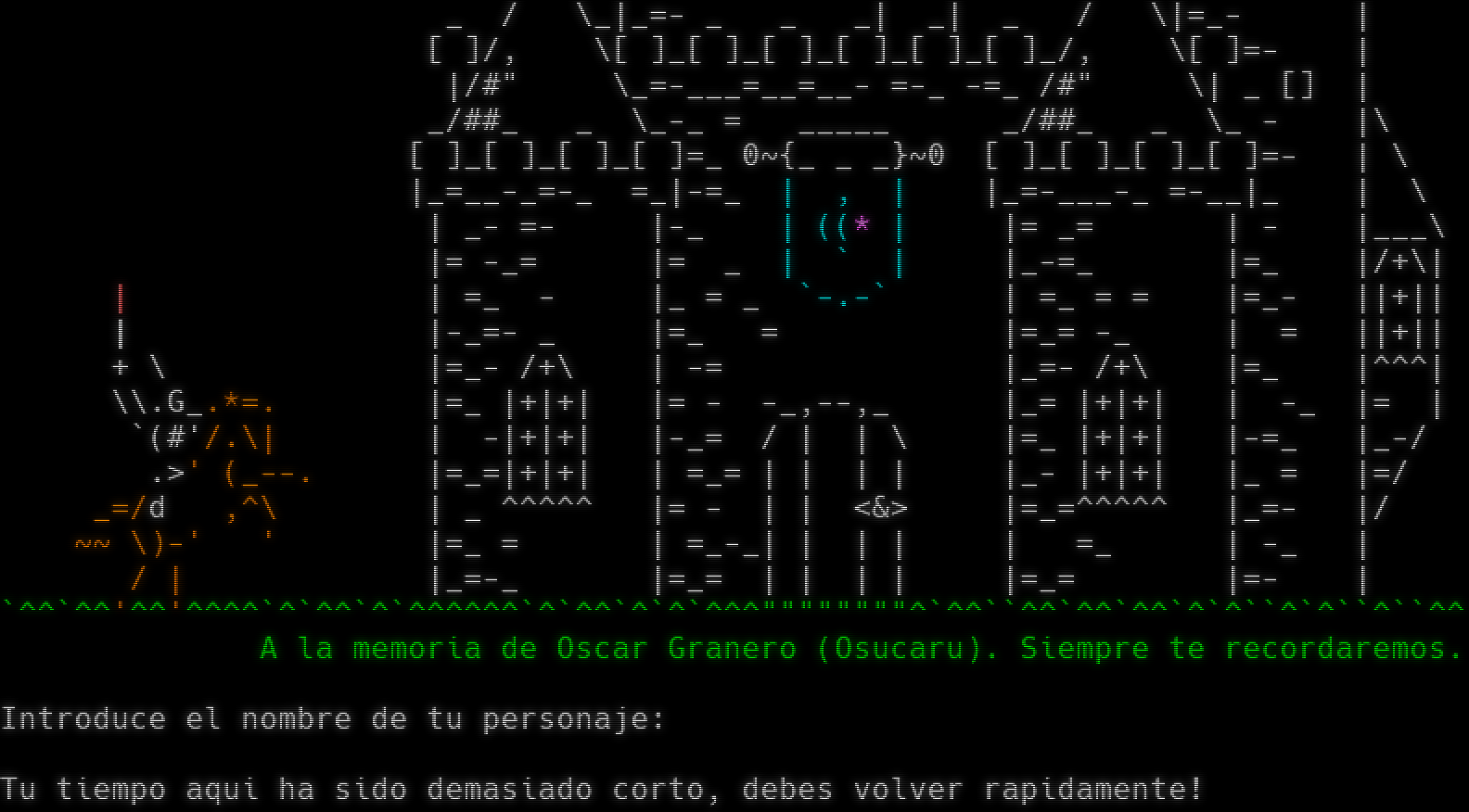 LPmud version: fluffos v2017-last-467-g59b1f480 RLII. Mudlib version: Pusa-v2.1 Si tienes dificultades de vision, ignora los caracteres que se mostraran a continuacion y dinos con que nombre quieres ser conocido. !_ .-,--. . ., . \|\*~​=-., \`\|__/ ,-. . ,-. ,-. ,-. ,-\| ,-. /) ,-. . . ,-. ,-. ,-\| ,-. \|_,-'\` )\| \\ \|-' \| \| \| \| \| \`-. \| \| \|-' / \|-' \| \| \|-' \| \| \| \| ,-\| \| \`' \` \`-' ' ' ' \`-' \`-' \`-^ \`-' '\`--' \`-' \`-\| \`-' ' ' \`-^ \`-^ \| Portada por Dunkelheit /\| El Renacimiento /^\\ \|'\`^\`'~​=-.,__,.​-=~'\`^\`'~=. !_ \`-' / \\ \| \| \|\*\`~-., /, \\ \| Administradores \| \|.​-~^\` /#" \\ \| Máquina: Oskuro \| \| _/##_ _ \\_ \| \| _ _\| _ _ _ [ ]_[ ]_[ ]_[ ] \| Mudlib: Eckol, Satyr\| [ ]_[ ]_[ ]_[ ]_[ ] \|_​=_-=_ - =_\| \| Juego: Eckol, Satyr \| !_ \|_=_ =​-_-_ = =_\| !_ \|=_= - \| \| \| \|\*\`--,_- _ \| \|\*\`~-.,= [] \| \| Consejo: Eckol \| \|.-'\|= [] \| !_ \|_​.-"\`_- \| \| \| \| \|_=- - \| \|\*\`~-., \| \|=_- \| ~'\`^\`'~​=-.,__,.​-=~'\`^\`'~=' /^\\ \|=_= - \| \|_,-~\` /^\\ \|_ - =[] \| _ / \\_\|_=- _ _ _\| _\| _ / \\\|=_- \| [ ]/, \\[ ]_[ ]_[ ]_[ ]_[ ]_[ ]_/, \\[ ]=- \| \|/#" \\_​=-___=__=__- =-_ -=_ /#" \\\| _ [] \| _/##_ _ \\_-_ = _​____ _/##_ _ \\_ - \|\\ [ ]_[ ]_[ ]_[ ]=_ 0~{_ _ _}~0 [ ]_[ ]_[ ]_[ ]=- \| \\ \|_​=__-_=-_ =_\|-=_ \| , \| \|_​=-___-_ =​-__\|_ \| \\ \| _- =- \|-_ \| ((\* \| \|= _= \| - \|___\\ \|= -_= \|= _ \| \` \| \|_​-=_ \|=_ \|/+\\\| \| \| =_ - \|_ = _ \`-.-\` \| =_ = = \|=_- \|\|+\|\| \| \|-​_=- _ \|=_ = \|=_= -_ \| = \|\|+\|\| + \\ \|=_- /+\\ \| -= \|_=- /+\\ \|=_ \|^^^\| \\\\.G_.\*=. \|=_ \|+\|+\| \|= - -_,--,_ \|_= \|+\|+\| \| -_ \|= \| \`(#'/.\\\| \| -\|+\|+\| \|-_= / \| \| \\ \|=_ \|+\|+\| \|-=_ \|_-/ .>' (_​--. \|=_=\|+\|+\| \| =_= \| \| \| \| \|_- \|+\|+\| \|_ = \|=/ _=/d ,^\\ \| _ ^​^^^^ \|= - \| \| <&> \|=​_=^^^^^ \|_=- \|/ ~~ \\)-' ' \|=_ = \| =​_-_\| \| \| \| \| =_ \| -_ \| / \| \|_​=-_ \|=_= \| \| \| \| \|=_= \|=- \| \`^^\`^^'^^'^​^^^\`^\`^^\`^\`^​^^^^^\`^\`^^\`^\`^\`^​^^""""""""^\`^^\`\`^^\`^^\`^^\`^\`^\`\`^\`^\`\`^\`\`^^ A la memoria de Oscar Granero (Osucaru). Siempre te recordaremos. Introduce el nombre de tu personaje:<VERSION> Tu tiempo aqui ha sido demasiado corto, debes volver rapidamente!