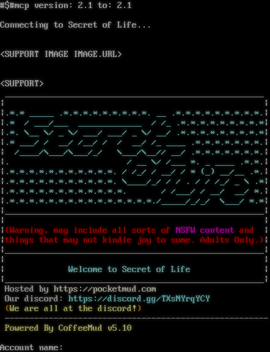 #$#mcp version: 2.1 to: 2.1 Connecting to Secret of Life... <SUPPORT IMAGE IMAGE.URL> <SUPPORT> _​____________________________________________________ \| \| \|.\*.\* _​____ .\*.\*.\*.\*.\*.\*.\*.\*.\*. __ .\*.\*.\*.\*.\*.\*.\*.\*.\*.\| \|.\* / ___/___ _​____________ / /_ .\*.\*.\*.\*.\*.\*.\*.\*.\*\| \|.\*. \\__ \\/ _ \\/ ___/ ___/ _ \\/ __/ .\*.\*.\*.\*.\*.\*.\*.\*.\*\| \|.\* ___/ / __/ /__/ / / __/ /_ _​___ .\*.\*.\*.\*.\*.\*.\*.\| \| /_​___/\\___/\\___/_/ \\___/\\__// __/ .\*.\*.\*.\*.\*.\*.\*.\| \|. / __ \\/ /___ \*. _ _​___ .\*.\*.\| \|.\*.\*.\*.\*.\*.\*.\*.\*.\*.\*.\*. / /_/ / __/ / \* (_) __/__ .\*.\| \|.\*.\*.\*.\*.\*.\*.\*.\*.\*.\*.\*. \\_​___/_/ / / . / / /_/ _ \\ .\*\| \|.\*.\*.\*.\*.\*.\*.\*.\*.\*.\*.\*.\*. / /___/ / __/ __/ \*.\| \|.\*.\*.\*.\*.\*.\*.\*.\*.\*.\*.\*.\*.\*.\*.\*./_​____/_/_/ \\___/ \*.\*\| \|_​____________________________________________________\| \| \| \|(Warning, may include all sorts of NSFW content and \| \|things that may not kindle joy to some. Adults Only.)\| \|_​____________________________________________________\| \| \| \| Welcome to Secret of Life \| \|_​____________________________________________________\| Hosted by https://pocketmud.com Our discord: https://discord.gg/TXsNYrqYCY (We are all at the discord!) -​----------------------------------------------------- Powered By CoffeeMud v5.10 Account name: