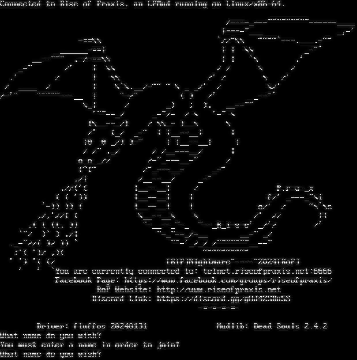 Connected to Rise of Praxis, an LPMud running on Linux/x86-64. /=​==-_---~~~~~~~~~------____ \|=​==-~___ _,-' -==\\\\ \`//~\\\\ ~​~~~\`-​--.___.-~~ _​_____-==\| \| \| \\\\ _-~\` _​_--~~~ ,-/-==\\\\ \| \| \`\\ ,' _-~ /' \| \\\\ / / \\ / .' / \| \\\\ /' / \\ /' / _​___ / \| \\\`\\.__/-~~ ~ \\ _ _/' / \\/' /-'~ ~​~~~~---__ \| ~-/~ ( ) /' _​--~\` \\_\| / _) ; ), _​_--~~ '~​~--_/ _-~/- / \\ '-~ \\ {\\_​_--_/} / \\\\_- )__\\ \\ /' (_/ _-~ \| \|_​_--__\| \| \|0 0 _/) )-~ \| \|_​_--__\| \| / /~ ,_/ / /_​_---__/ \| o o _// /-​~_---__-~ / (^(~ /~​_---__- _-~ ,/\| /_​_--__/ _-~ ,//('( \|_​_--__\| / P.r-a-_x ( ( ')) \|_​_--__\| \| f/' _​---_~\\i \`-)) )) ( \|_​_--__\| \| o/' / ~\\\`\\s ,/,'//( ( \\_​_--__\\ \\ /' // \|\| ,( ( ((, )) ~​-__--_~-_ ~​--_R_i-s-e' _/'/ /' \`~/ )\` ) ,/\| ~​-_~--_/-__ _​_-~ _/ .​_-~//( )/ )) \` ~~-'_/_/ /~​~~~~~~__--~ ;'( ')/ ,)( ~​~~~~~~~~~ ' ') '( (/ [RiP]Nightmare~​----~2024[RoP] ' ' \`You are currently connected to: telnet.riseofpraxis.net:6666 Facebook Page: https://www.facebook.com/groups/riseofpraxis/ RoP Website: http://www.riseofpraxis.net Discord Link: https://discord.gg/gUJ4ZSBu5S -​=-=-=-=- Driver: fluffos 20240131 Mudlib: Dead Souls 2.4.2 What name do you wish? You must enter a name in order to join! What name do you wish?