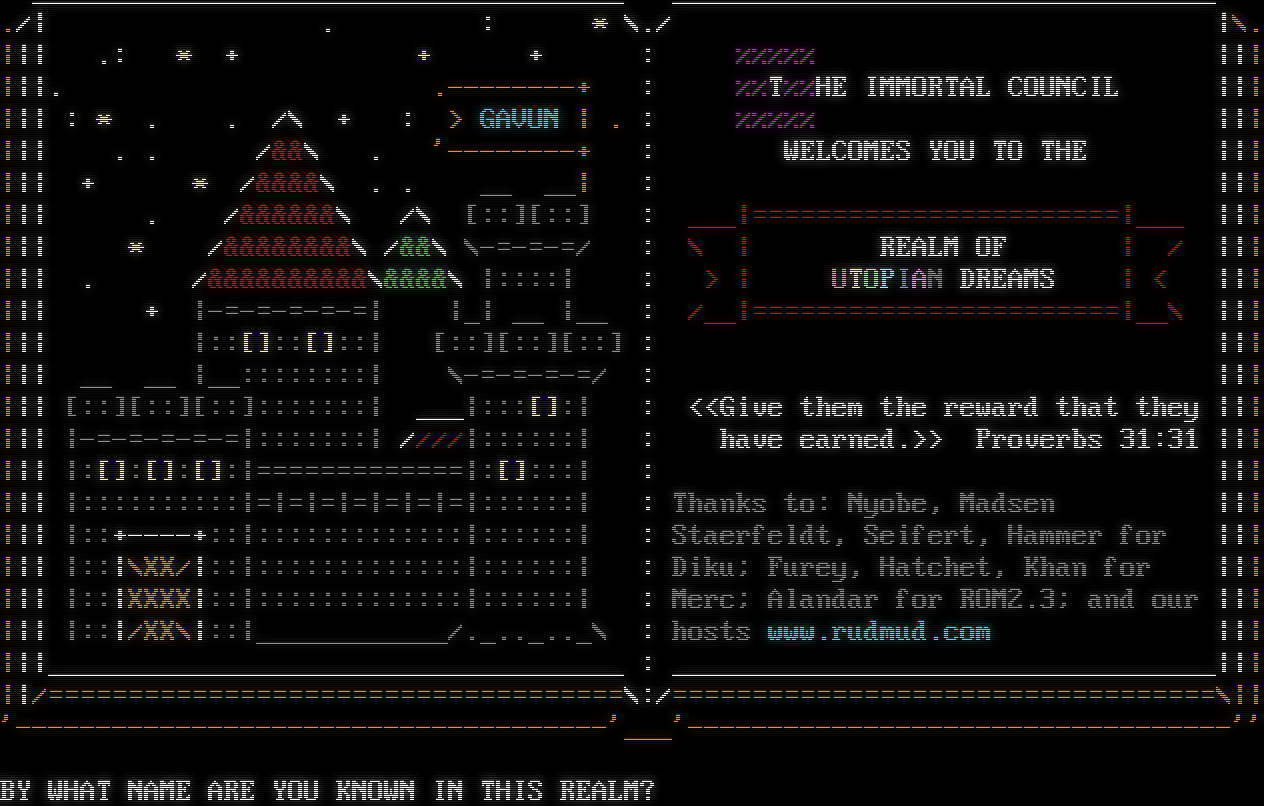_​____________________________________ _​_________________________________ ./\| . : \* \\./ \|\\. \|\|\| .: \* + + + : %%%%% \|\|\| \|\|\|. .​--------+ : %%T%%HE IMMORTAL COUNCIL \|\|\| \|\|\| : \* . . /\\ + : > GAVUN \| . : %%%%% \|\|\| \|\|\| . . /&&\\ . '-​-------+ : WELCOMES YOU TO THE \|\|\| \|\|\| + \* /&&&&\\ . . __ __\| : \|\|\| \|\|\| . /&&&&&&\\ /\\ [::][::] : ___\|=​======================\|___ \|\|\| \|\|\| \* /&&&&&&&&\\ /&&\\ \\-​=-=-=/ : \\ \| REALM OF \| / \|\|\| \|\|\| . /&&&&&&&&&&\\&&&&\\ \|::::\| : > \| UTOPIAN DREAMS \| < \|\|\| \|\|\| + \|-​=-=-=-=-=\| \|_\| __ \|__ : /__\|=​======================\|__\\ \|\|\| \|\|\| \|::[]::[]::\| [::][::][::] : \|\|\| \|\|\| __ __ \|__::::::::\| \\-​=-=-=-=/ : \|\|\| \|\|\| [::][::][::]:::::::\| ___\|:::[]:\| : <<Give them the reward that they \|\|\| \|\|\| \|-​=-=-=-=-=\|:::::::\| ////\|::::::\| : have earned.>> Proverbs 31:31 \|\|\| \|\|\| \|:[]:[]:[]:\|=​============\|:[]:::\| : \|\|\| \|\|\| \|::::::::::\|=\|=\|=\|=\|=\|=\|=\|::::::\| : Thanks to: Nyobe, Madsen \|\|\| \|\|\| \|::+​----+::\|:::::::::::::\|::::::\| : Staerfeldt, Seifert, Hammer for \|\|\| \|\|\| \|::\|\\XX/\|::\|:::::::::::::\|::::::\| : Diku; Furey, Hatchet, Khan for \|\|\| \|\|\| \|::\|XXXX\|::\|:::::::::::::\|::::::\| : Merc; Alandar for ROM2.3; and our \|\|\| \|\|\| \|::\|/XX\\\|::\|_​___________/.​_.._.._\\ : hosts www.rudmud.com \|\|\| \|\|\|_​___________________________________ : _​_________________________________\|\|\| \|\|/=​===================================\\:/=​=================================\\\|\| '-​------------------------------------'___'-​---------------------------------'' BY WHAT NAME ARE YOU KNOWN IN THIS REALM?