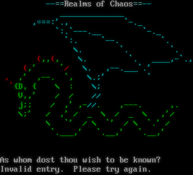 -​-==Realms of Chaos=​=-- _​_____________ ,===:'., \`-._ \`:.\`-​--.__ \`-._ \`:. \`--. \`. \\. \`. \`. (,,(, \\. \`. _​___,-\`., (,' \`/ \\. ,-​-.___\`.' , ,' ,--. \`, \\.;' \` \`{D, { \\ : \\; V,,' / / // j;; / ,' ,-//. ,-​--. ,. \\;' / ,' / _ \\ / _ \\ ,'/ \\ \`' / \\ \`' / \\ \`.' / \`.​___,' \`.__,' \`.__,' As whom dost thou wish to be known? Invalid entry. Please try again.