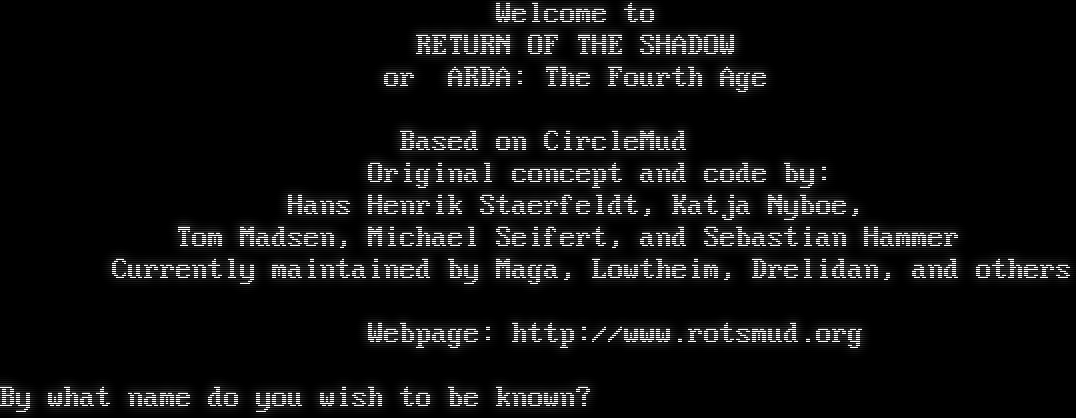 Welcome to RETURN OF THE SHADOW or ARDA: The Fourth Age Based on CircleMud Original concept and code by: Hans Henrik Staerfeldt, Katja Nyboe, Tom Madsen, Michael Seifert, and Sebastian Hammer Currently maintained by Maga, Lowtheim, Drelidan, and others Webpage: http://www.rotsmud.org By what name do you wish to be known?