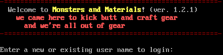 -​=====================================================- Welcome to Monsters and Materials! (ver. 1.2.1) we came here to kick butt and craft gear and we're all out of gear -​=====================================================- Enter a new or existing user name to login: