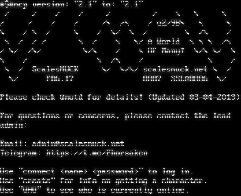 #$#mcp version: "2.1" to: "2.1" / / / / / / \\ \\ \\ / / / / /\\ /\\ / o2/98\\ \\ \\ \\ / \\ / \\ / \\/ \\ / \\ /\\ / \\ / / / \\ / \\ \\/ A World \\ \\ \\ /\\ / \\/ /\\/ \\/\\ / \\ Of Many! \\/\\ \\/ \\ \\ / \\ /\\ / \\ / \\ / ScalesMUCK \\/ \\/\\/ scalesmuck.net \\ / \\/ FB6.17 8887 SSL@8886 \\/ Please check @motd for details! (Updated 03-04-2019) For questions or concerns, please contact the lead admin: Email: admin@scalesmuck.net Telegram: https://t.me/Phorsaken Use "connect <name> <password>" to log in. Use "create" for info on getting a character. Use "WHO" to see who is currently online.