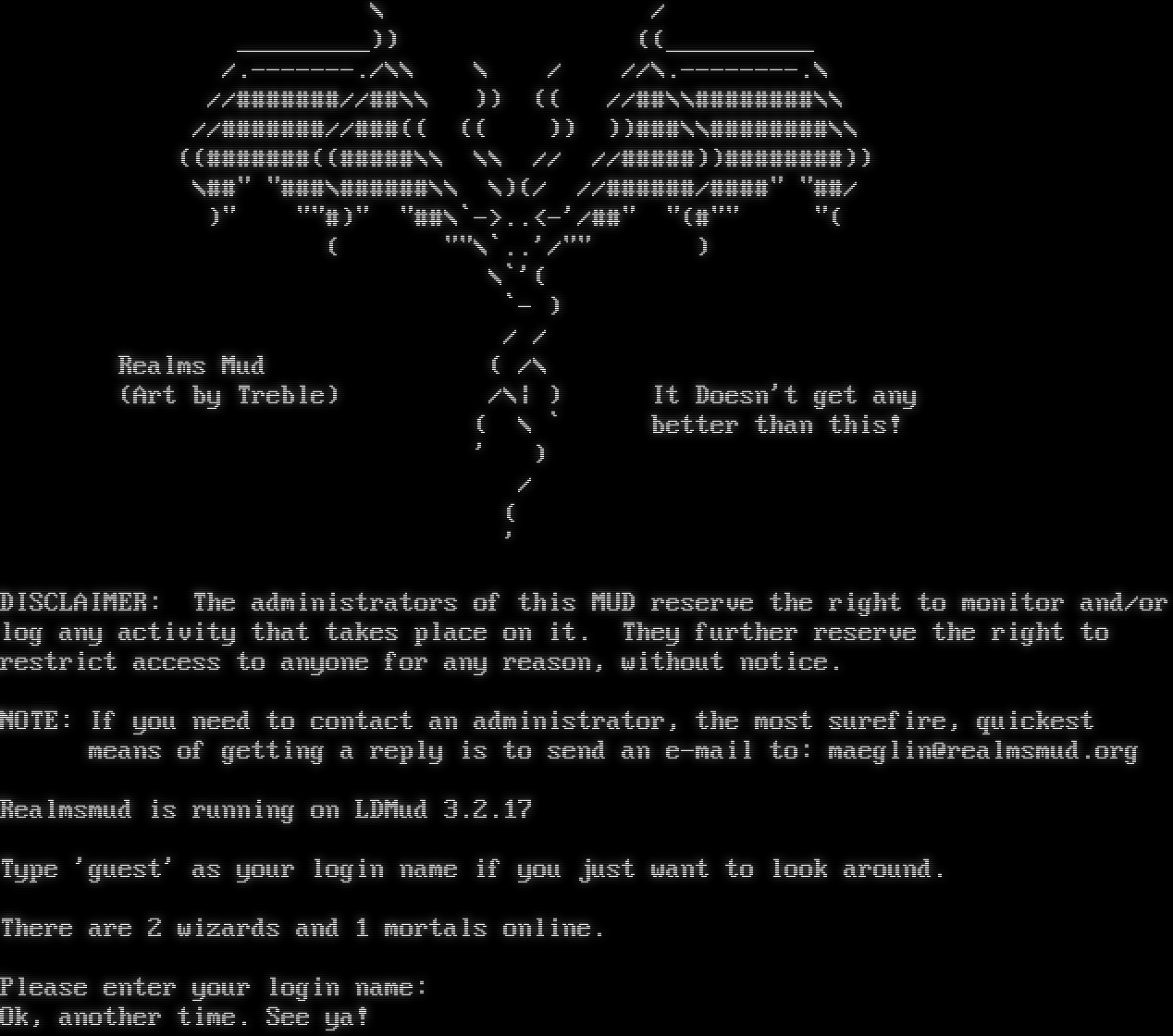 \\ / _​________)) ((_​_________ /.​-------./\\\\ \\ / //\\.​--------.\\ //#​######//##\\\\ )) (( //##\\\\#​#######\\\\ //#​######//###(( (( )) ))###\\\\#​#######\\\\ ((#​######((#​####\\\\ \\\\ // //#​####))#​#######)) \\##" "​###\\#​#####\\\\ \\)(/ //#​#####/#​###" "##/ )" ""#)" "##\\\`->..<-'/##" "(#"" "( ( ""\\\`..'/"" ) \\\`'( \`- ) / / Realms Mud ( /\\ (Art by Treble) /\\\| ) It Doesn't get any ( \\ \` better than this! ' ) / ( ' DISCLAIMER: The administrators of this MUD reserve the right to monitor and/or log any activity that takes place on it. They further reserve the right to restrict access to anyone for any reason, without notice. NOTE: If you need to contact an administrator, the most surefire, quickest means of getting a reply is to send an e-mail to: maeglin@realmsmud.org Realmsmud is running on LDMud 3.2.17 Type 'guest' as your login name if you just want to look around. There are 2 wizards and 1 mortals online. Please enter your login name: Ok, another time. See ya!