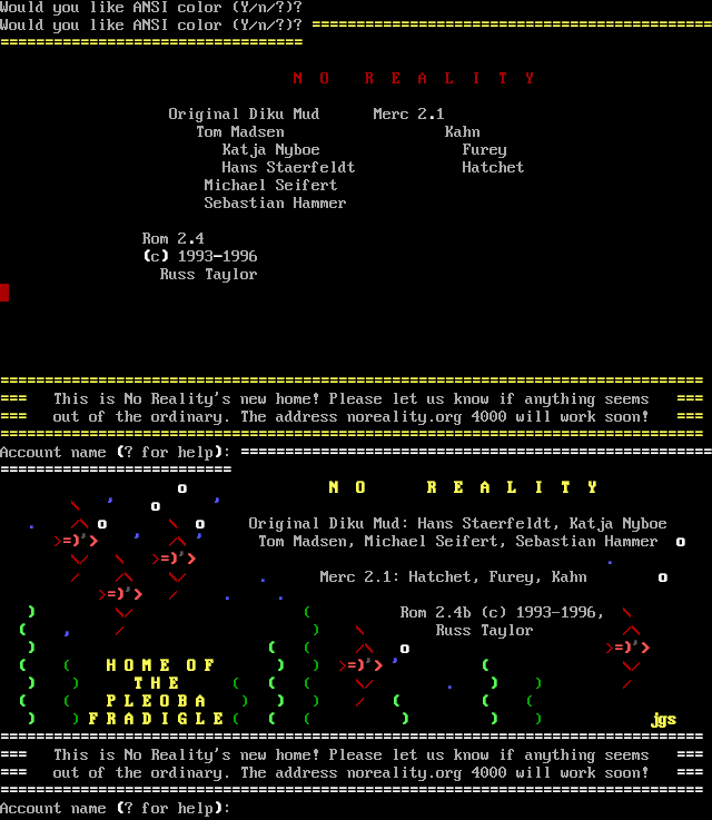 Would you like ANSI color (Y/n/?)? Would you like ANSI color (Y/n/?)? =​============================================================================== N O R E A L I T Y Original Diku Mud Merc 2.1 Tom Madsen Kahn Katja Nyboe Furey Hans Staerfeldt Hatchet Michael Seifert Sebastian Hammer Rom 2.4 (c) 1993-1996 Russ Taylor =​============================================================================== === This is No Reality's new home! Please let us know if anything seems === === out of the ordinary. The address noreality.org 4000 will work soon! === =​============================================================================== Account name (? for help): =​============================================================================== o N O R E A L I T Y \\ ' o ' . /\\ o \\ o Original Diku Mud: Hans Staerfeldt, Katja Nyboe >=)'> ' /\\ ' Tom Madsen, Michael Seifert, Sebastian Hammer o \\/ \\ >=)'> . / /\\ \\/ . Merc 2.1: Hatchet, Furey, Kahn o >=)'> / . . ) \\/ ( Rom 2.4b (c) 1993-1996, \\ ( , / ) \\ Russ Taylor /\\ ) ( ( /\\ o >=)'> ( ( H O M E O F ) ) >=)'> ' ( \\/ ) ) T H E ( ( ( \\/ . ) ) / ( ( P L E O B A ) ) ) / ( ( ( ) ) F R A D I G L E ( ( ( ) ) ) jgs =​============================================================================== === This is No Reality's new home! Please let us know if anything seems === === out of the ordinary. The address noreality.org 4000 will work soon! === =​============================================================================== Account name (? for help):