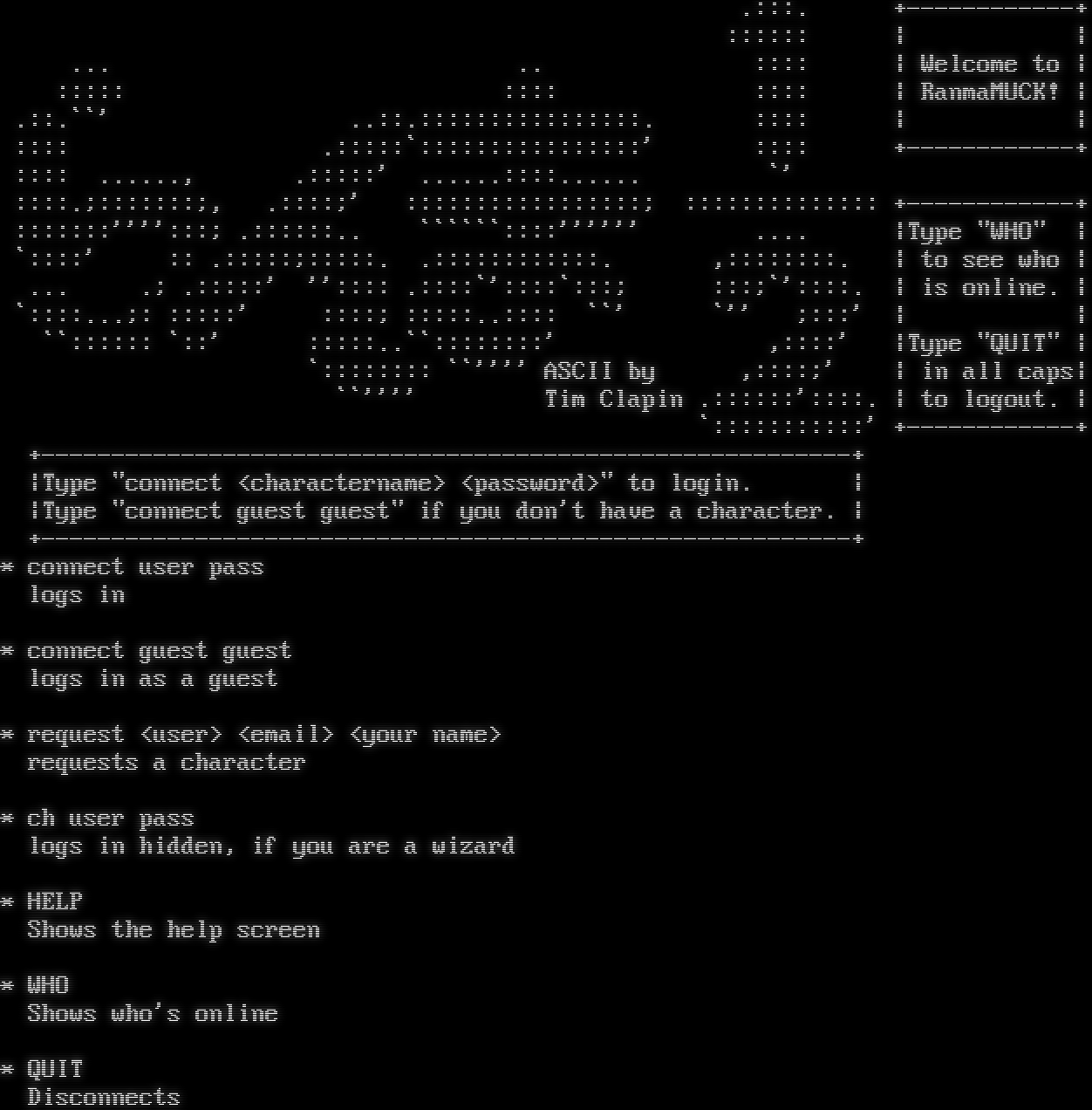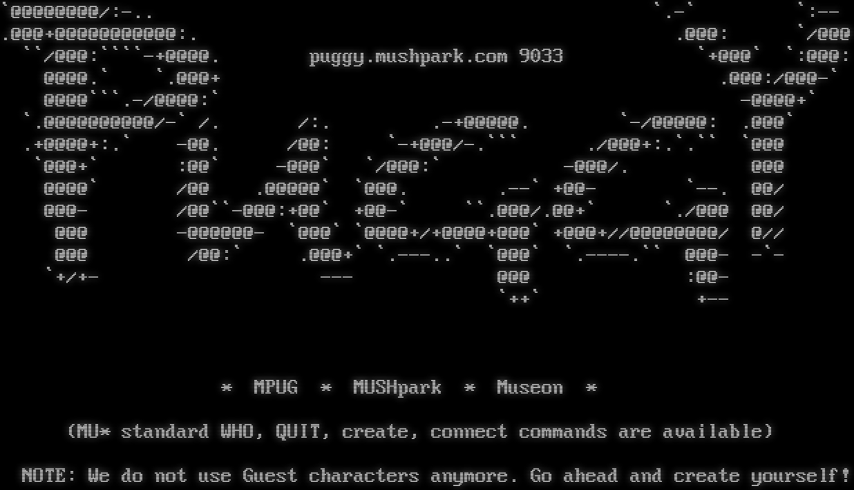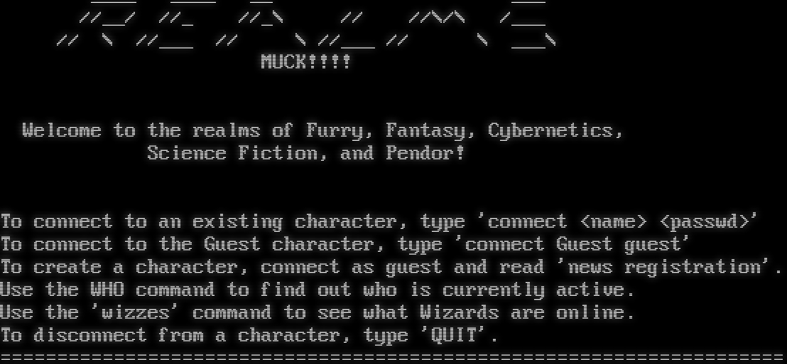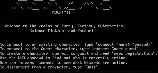_​___ _​___ __ ___ //__/ //_ //_\\ // //\\/\\ /___ // \\ //___ // \\ //___ // \\ ___\\ MUCK!!!! Welcome to the realms of Furry, Fantasy, Cybernetics, Science Fiction, and Pendor! To connect to an existing character, type 'connect <name> <passwd>' To connect to the Guest character, type 'connect Guest guest' To create a character, connect as guest and read 'news registration'. Use the WHO command to find out who is currently active. Use the 'wizzes' command to see what Wizards are online. To disconnect from a character, type 'QUIT'. =​====================================================================
