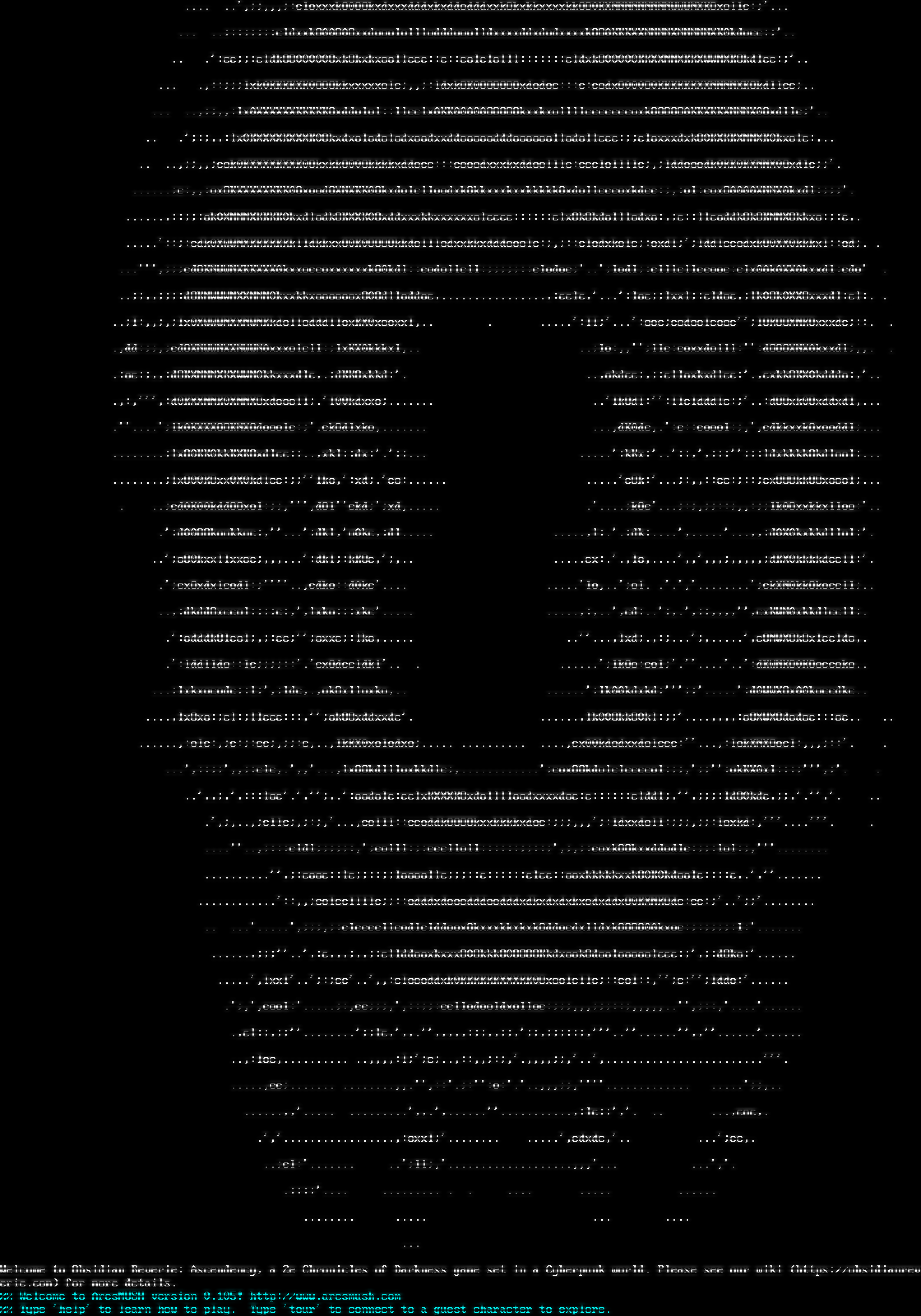 .. . .​...',;:::;;,,''.​................. ... .​......',;:cloddolllc::;;;,,,,,,'.​............ .​... ...'',,;::clloodddddddddlc:::::clc:;;,,''.​......... .​.... .​....';loddxxxxkkkOOOO00000Okxddddddddolcc::;;,,'.​....... .​... .​....';coxO0000000KKKXXNNNNNNNNXKKKKXXXXKK0Okxdolc:;;;:;'.​..... .​... .​....';:codxxkOKKXXXXNNNNWWWWWWWNNNNNNWWWWWWWWWWNXK0Oxocc::::,.​.... ... .​...',;;:ccclodkOKXXXXXXXXXXNNNNNNNXXXXXXNNWWWWWWWMMMMWWNKOxoc:;;;,'.​.... ... ...'',,;;::cccodxkkO000KKXXXXKKKKKKKKKKXXXXXXXXNNNNNNNWWWMMMWWNKOxoc;;;,,'.​... ... ..',,,,,;:cllodddxkkkO00OO0000OOOkkkkkkOOO000OO00KKXXXNNNNWWWWWWWWNX0kdc:;;;;,... .​... ..',;;,,,;:cloxxxkO0OOkxdxxxdddxkxddodddxxkOkxkkxxxxkkOO0KXNNNNNNNNNWWWNXKOxollc:;'... ... ..;::;;;;:cldxxkO00O0OxxdooololllodddooolldxxxxddxdodxxxxkOO0KKKXXNNNNXNNNNNXK0kdocc:;'.. .. .':cc;;:cldkOO00000OxkOkxkxoollccc::c::colclolll:::::::cldxkO00000KKXXNNXKKXWWNXKOkdlcc:;'.. ... .,::;;;lxk0KKKKXK0OOOkkxxxxxolc;,,;:ldxkOK0OOOOOOxdodoc:::c:codxO000O0KKKKKKXXNNNNXKOkdllcc;.. ... ..,;;,,:lx0XXXXXXKKKKKOxddolol::llcclx0KK00000OOOOOkxxkxollllcccccccoxkOOOOO0KKXKKXNNNX0Oxdllc;'.. .. .';:;,,:lx0KXXXXKXXXK0Okxdxolodolodxoodxxddooooodddoooooollodollccc:;;cloxxxdxkO0KXKKXNNXK0kxolc:,.. .. ..,;;,,;cok0KXXXXKXXK0OkxkkO00Okkkkxddocc:::cooodxxxkxddoolllc:ccclollllc;,;lddooodk0KK0KXNNX0Oxdlc;;'. .​.....;c:,,:oxOKXXXXXKKK0OxoodOXNXKK0OkxdolclloodxkOkkxxxkxxkkkkkOxdollcccoxkdcc:;,:ol:coxO0000XNNX0kxdl:;;;'. .​.....,::;;:ok0XNNNXKKKK0kxdlodkOKXXK0Oxddxxxkkxxxxxxolcccc::::::clxOkOkdolllodxo:,;c::llcoddkOkOKNNXOkkxo:;:c,. .​....'::;:cdk0XWWNXKKKKKKklldkkxxO0K0OOOOkkdolllodxxkkxdddooolc:;,;::clodxkolc;:oxdl;';lddlccodxkO0XX0kkkxl::od;. . ...''',;;;cdOKNWWNXKKXXX0kxxoccoxxxxxxkO0kdl::codollcll:;;;;;::clodoc;'..';lodl;:clllcllccooc:clx00k0XX0kxxdl:cdo' . ..;;,,;;;:dOKNWWWNXXNNN0kxxkkxooooooxO0Odlloddoc,.​...............,:cclc,'...':loc;;lxxl;:cldoc,;lk0Ok0XXOxxxdl:cl:. . ..;l:,,;,;lx0XWWWNXXNWNKkdollodddlloxKX0xooxxl,.. . .​....':ll;'...':ooc;codoolcooc'';lOKOOXNKOxxxdc;::. . .,dd:;;,;cdOXNWWNXXNWWN0xxxolcll:;lxKX0kkkxl,.. ..;lo:,,'';llc:coxxdolll:'':dOOOXNX0kxxdl;,,. . .:oc:;,,:dOKXNNNXKXWWN0kkxxxdlc,.;dKKOxkkd:'. ..,okdcc;,;:clloxkxdlcc:'.,cxkkOKX0kdddo:,'.. .,:,''',:d0KXXNNK0XNNXOxdoooll;.'l00kdxxo;.​...... ..'lkOdl:'':llcldddlc:;'..:dOOxk0Oxddxdl,... .''.​...';lk0KXXXOOKNXOdooolc:;'.ckOdlxko,.​...... ...,dK0dc,.':c::coool:;,',cdkkxxkOxooddl;... .​.......;lxO0KK0kkKXKOxdlcc:;..,xkl::dx:'.';;... .​....':kKx:'..'::,',;;;'';;:ldxkkkkOkdlool;... .​.......;lxO00KOxx0X0kdlcc:;;''lko,':xd;.'co:.​..... .​....'cOk:'...;:,,::cc:;::;cxOOOkkOOxoool;... . ..;cd0K00kddOOxol:;;,''',dOl''ckd;';xd,.​.... .'.​...;kOc'...;:;,;;::;,,:;;lk0Oxxkkxlloo:'.. .':d00OOkookkoc;,''...';dkl,'o0kc,;dl.​.... .​....,l;.'.;dk:.​...',.​....'...,,:d0X0kxkkdllol:'. ..';oO0kxxllxxoc;,,,...':dkl;:kKOc,';,.. .​....cx:.'.,lo,.​...',,',,,;,,,,,;dKX0kkkkdccll:'. .';cxOxdxlcodl:;''''..,cdko::d0kc'.​... .​....'lo,..';ol. .'.','.​.......';ckXN0kkOkoccll;.. ..,:dkddOxccol:;;;c:,',lxko:;:xkc'.​.... .​....,:,..',cd:..';,.',;;,,,,'',cxKWN0xkkdlccll;. .':odddkOlcol;,;:cc;'';oxxc;:lko,.​.... ..''...,lxd;.,:;...';,.​....',cONWXOkOxlccldo,. .':lddlldo::lc;;;;::'.'cxOdccldkl'.. . .​.....';lkOo:col;'.''.​...'..':dKWNKO0KOoccoko.. ...;lxkxocodc;:l;',;ldc,.,okOxlloxko,.. .​.....';lk00kdxkd;''';;'.​....':d0WWXOx00koccdkc.. .​...,lxOxo:;cl:;llccc:::,'';okOOxddxxdc'. .​.....,lk00OkkO0kl:;;'.​...,,,,:oOXWXOdodoc:::oc.. .. .​.....,:olc:,;c:;:cc;,;;:c,..,lkKX0xolodxo;.​.... .​......... .​...,cx00kdodxxdolccc:''...,:lokXNXOocl:,,,;::'. . ...',::;;',,;:clc,.',,'...,lxOOkdllloxkkdlc;,.​...........';coxOOkdolclccccol:;;,';;'':okKX0xl:::;''',;'. . ..',,;,',:::loc'.','';,.':oodolc:cclxKXXXKOxdolllloodxxxxdoc:c::::::clddl;,'',;;;:ldO0kdc,;;,'.'','. .. .',;,..,;cllc;,;:;,'...,colll::ccoddkOOOOkxxkkkkxdoc:;;;,,,';:ldxxdoll:;;;,;;:loxkd:,'''.​...'''. . .​...''..,;:::cldl;;;;;:,';colll:;:ccclloll::::::;;::;',;,;:coxkOOkxxddodlc:;;:lol:;,'''.​....... .​.........'',;:cooc::lc;;::;;loooollc;;;::c::::::clcc::ooxkkkkkxxkO0K0kdoolc::::c,.',''.​...... .​...........'::,,;colccllllc;;::odddxdooodddoodddxdkxdxdxkxodxddxO0KXNKOdc:cc:;'..';;'.​....... .. ...'.​....',;;;,;:clccccllcodlclddooxOkxxxkkxkxkOddocdxlldxkOOOO00kxoc:;:;;;;:l:'.​...... .​.....,;;;''..',:c,,,;,,;:cllddooxkxxxO0OkkkO0OOOOKkdxookOdoolooooolccc:;',;:dOko:'.​..... .​....',lxxl'..';:;cc'..',,:cloooddxk0KKKKKKXXXKK0Oxoolcllc;::col::,'';c:'';lddo:'.​..... .';,',cool:'.​....;:,cc;;;,',::;;:ccllodooldxolloc:;;;,,,;;;::;,,,,,..'',;::,'.​...'.​..... .,cl:;,;;''.​.......';;lc,',,.'',,,,,:;;,,;;,';;,;;;::;,'''..''.​.....'',,''.​.....'.​..... ..,:loc,.​......... ..,,,,:l;';c;..,::,,;:;,'.,,,,;;,'..',.​.......................'''. .​....,cc;.​...... .​.......,,.'',::'.;:'':o:'.'..,,,;;,''''.​............ .​....';;,.. .​.....,,'.​.... .​........',,.',.​.....''.​..........,:lc;;','. .. ...,coc,. .','.​................,:oxxl;'.​....... .​....',cdxdc,'.. ...';cc,. ..;cl:'.​...... ..';ll;,'.​..................,,,'... ...','. .;::;'.​... .​........ . . .​... .​.... .​..... .​....... .​.... ... .​... ... Welcome to Obsidian Reverie: Ascendency, a 2e Chronicles of Darkness game set in a Cyberpunk world. Please see our wiki (https://obsidianreverie.com) for more details. %% Welcome to AresMUSH version 0.105! http://www.aresmush.com %% Type 'help' to learn how to play. Type 'tour' to connect to a guest character to explore.