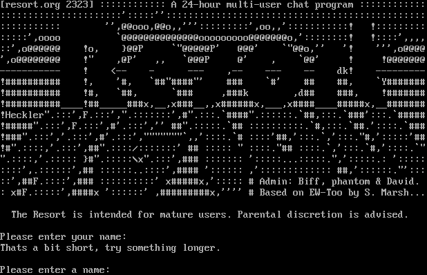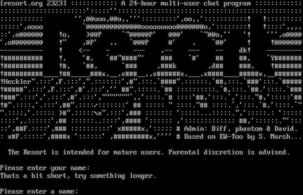 [resort.org 2323] :::::::::::: A 24-hour multi-user chat program :::::::::::: ::::::::::::::::::::::':::::''::::::::::::::::::::::::::::::::::::::::::::::: ::::::::::: '',@@ooo,@@o,,''':::::::::',oo,,':::::::::::! !::::::::: :::::',oooo \`@@@@@@@@@@@@@@ooooooooo@@@@@@@o,'::::::::! !::::',,,, ::',o@@@@@@ !o, }@@P \`"@@@@@P' @@@' \`"@@o,'' '! ''',o@@@@ ',o@@@@@@@@ !" ,@P' ,, \`@@@P @' , \`@@' ! !@@@@@@@ -​---------- ! <-- - --- ,-- --- -- dk! -​-------- !#​######### !, '#, \`#​#"####"' ### \`#' ## ##, \`Y#​###### !#​######### !#, \`##, \`### ,###k ,d## ###, !#​###### !#​#########____!#​#_____###x,__,x#​##__,,x#​#####x,___,x#​###____#####x,_​_####### !Heckler".:::',F.:::',".:::::::',#".:::.\`#​###".::::::.\`##,:::.\`###':::.\`#​#### !#​####".:::',F.:::',#'.:::','' #​#".:::::.\`## ::::::::::.\`#,:::.\`##.'::::.\`### !#​##".:::','.:::',#'.:::',"​""""""\`,,'::::.\`# ::::'##,':::.\`,':::."#,':::::'## !#".::::,'.:::',#​#".::::/:::::::' ## ::::: " ::::.​"## ::::.\`,':::.\`#,'::::.\`" ".::::,'.::::: }#".:::::\\x".:::',### ::::::: ':::::...:::::.",':::::.: '::::: ::::',.::::::',## ::::::..::::',#​### ':::::: ,'::::::::::::: ##,'::::::."'::: ::',##F.::::',### ::::::::::' x#​####x,'::::: # Admin: Biff, phantom & David. : x#F.:::::',#​###x '::::::' ,#​########x,'''' # Based on EW-Too by S. Marsh... The Resort is intended for mature users. Parental discretion is advised. Please enter your name: Thats a bit short, try something longer. Please enter a name: