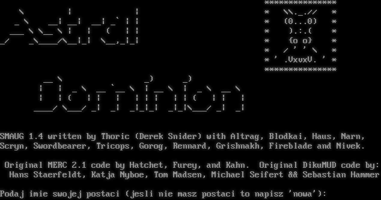 \*\*\*\*\*\*\*\*\*\*\*\*\*\*\* \\ \| \| \* \\\\._.// \* _ \\ __\| __\| __\| _\` \| \| \* (0...0) \* ___ \\ \\__ \\ \| \| ( \| \| \* ).:.( \* _/ _\\_​___/\\__\|_\| \\__,_\|_\| \* {o o} \* \* / ' ' \\ \* \* ' .VxvxV. ' \* \*\*\*\*\*\*\*\*\*\*\*\*\*\*\* __ \\ _) _) \| \| _ \\ __ \`__ \\ \| __ \\ \| _ \\ __ \\ \| \| ( \| \| \| \| \| \| \| \| ( \| \| \| _​___/ \\___/ _\| _\| _\|_\|_\| _\|_\|\\___/ _\| _\| SMAUG 1.4 written by Thoric (Derek Snider) with Altrag, Blodkai, Haus, Narn, Scryn, Swordbearer, Tricops, Gorog, Rennard, Grishnakh, Fireblade and Nivek. Original MERC 2.1 code by Hatchet, Furey, and Kahn. Original DikuMUD code by: Hans Staerfeldt, Katja Nyboe, Tom Madsen, Michael Seifert && Sebastian Hammer Podaj imie swojej postaci (jesli nie masz postaci to napisz 'nowa'):