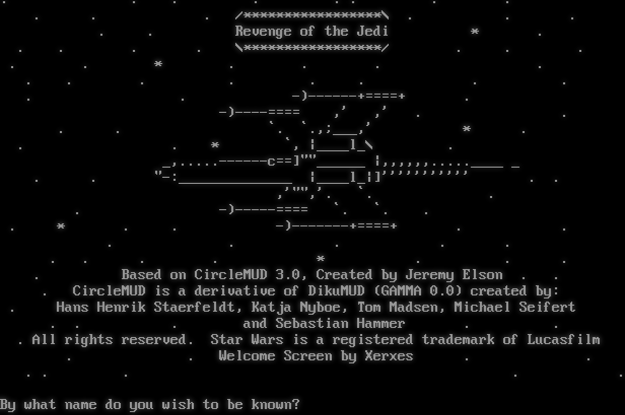 . . . . . . . . . . . /\*\*\*\*\*\*\*\*\*\*\*\*\*\*\*\*\*\\ . . . . . Revenge of the Jedi \* . . . . . \\\*\*\*\*\*\*\*\*\*\*\*\*\*\*\*\*\*/ . . . . . \* . . . . . . . . . . . . . . -)-​-----+====+ . -)-​---==== ,' ,' . . . . \`. \`.,;___,' \* . . . \* \`, \|_​___l_\\ . _,.​....------c==]"​"______ \|,,,,,,.​....____ _ . . "-:_​_____________ \|_​___l_\|]''''''''''' . . ,'"",'. \`. . . -)-​----==== \`. \`. . . \* . . -)-​------+====+ . . . . . . . . . . . \* . . . . Based on CircleMUD 3.0, Created by Jeremy Elson . . . CircleMUD is a derivative of DikuMUD (GAMMA 0.0) created by: . Hans Henrik Staerfeldt, Katja Nyboe, Tom Madsen, Michael Seifert . . . and Sebastian Hammer . . . All rights reserved. Star Wars is a registered trademark of Lucasfilm . . Welcome Screen by Xerxes . . . . . . . By what name do you wish to be known? Please wait By what name do you wish to be known?