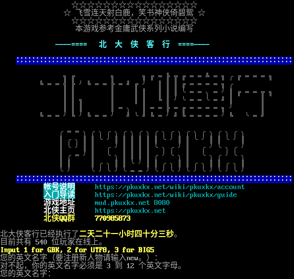 ☆☆☆☆☆☆☆☆☆☆☆☆☆☆☆☆ ☆ 飞雪连天射白鹿,笑书神侠倚碧鸳 ☆ ☆☆☆☆☆☆☆☆☆☆☆☆☆☆☆☆ 本游戏参考金庸武侠系列小说编写 -​---==== 北 大 侠 客 行 =​===---- ∷∷∷∷∷∷∷∷∷∷∷∷∷∷∷∷∷∷∷∷∷∷∷∷∷∷∷∷∷∷∷∷∷∷∷ ╗╔ ╗ ╗╔═╠╦╔══╩═╗╭╔═══╗ ╚══╣╠╯╚══╠═╝╔╯ ║║║╔════╗╭ ║║ ║ ║║ ║║║╰══╮═╯║╔══╦╗ ║║╗ ║ ║║ ╚║╯╰══╰═╝║ ║ ║║║ ║═╮ ║══╠═╔════╗╯ ║ ╚══╯╚╯╚══╯ ╝╰╝╚═╯╝╚════╯╚ ╰═╝ ╭══╮╭╮╭╮╭╮╭╮╭╮╭╮╭╮╭╮╭╮╭╮ ║╭╮║║╰╯║║║║║║╰╯║║╰╯║║╰╯║ ║╰╯║║ ╭╯║║║║╰╮╭╯║ ╭╯╰╮╭╯ ║╭═╯║ ╰╮║║║║╭╯╰╮║ ╰╮╭╯╰╮ ║║ ║╭╮║║╰╯║║╭╮║║╭╮║║╭╮║ ╰╯ ╰╯╰╯╰══╯╰╯╰╯╰╯╰╯╰╯╰╯ ∷∷∷∷∷∷∷∷∷∷∷∷∷∷∷∷∷∷∷∷∷∷∷∷∷∷∷∷∷∷∷∷∷∷∷ 帐号说明 https://pkuxkx.net/wiki/pkuxkx/account 入门导读 https://pkuxkx.net/wiki/pkuxkx/guide 游戏地址 mud.pkuxkx.net 8080 北侠主页 https://pkuxkx.net 北侠QQ群 770985873 北大侠客行已经执行了二天二十一小时四十分三秒。 目前共有 540 位玩家在线上。 Input 1 for GBK, 2 for UTF8, 3 for BIG5 您的英文名字(要注册新人物请输入new。): 对不起,你的英文名字必须是 3 到 12 个英文字母。 您的英文名字: