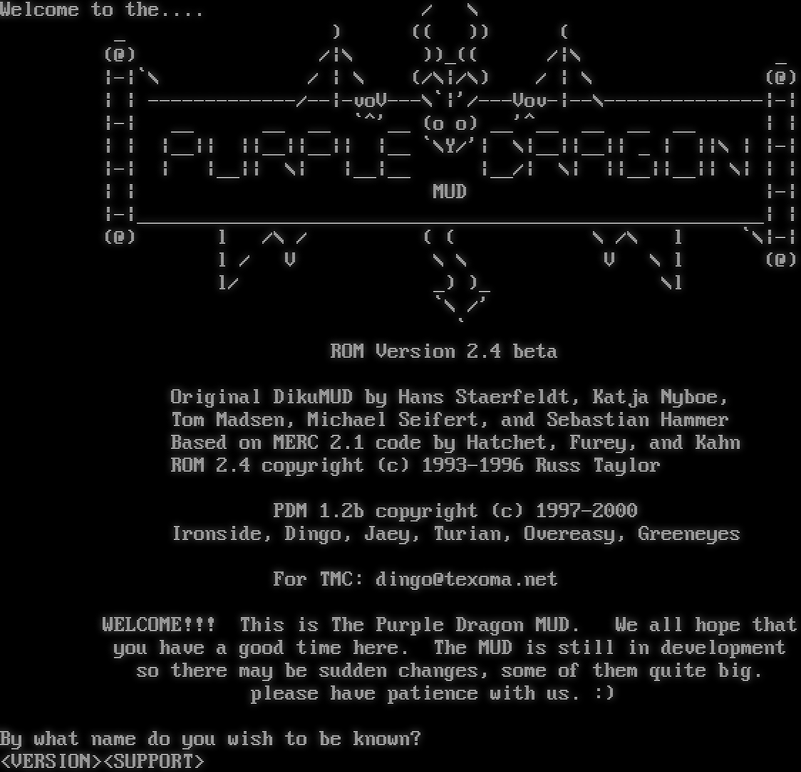 Welcome to the.​... / \\ _ ) (( )) ( (@) /\|\\ ))_(( /\|\\ _ \|-\|\`\\ / \| \\ (/\\\|/\\) / \| \\ (@) \| \| -​------------/--\|-voV---\\\`\|'/---Vov-\|--\\-​-------------\|-\| \|-\| __ __ __ \`^'__ (o o) __'^__ __ __ __ \| \| \| \| \|__\|\| \|\|__\|\|__\|\| \|__ \`\\Y/'\| \\\|__\|\|__\|\| _ \| \|\|\\ \| \|-\| \|-\| \| \|__\|\| \\\| \|__\|__ \|__/\| \\\| \|\|__\|\|__\|\| \\\| \| \| \| \| MUD \|-\| \|-\|_​______________________________________________________\| \| (@) l /\\ / ( ( \\ /\\ l \`\\\|-\| l / V \\ \\ V \\ l (@) l/ _) )_ \\l \`\\ /' \` ROM Version 2.4 beta Original DikuMUD by Hans Staerfeldt, Katja Nyboe, Tom Madsen, Michael Seifert, and Sebastian Hammer Based on MERC 2.1 code by Hatchet, Furey, and Kahn ROM 2.4 copyright (c) 1993-1996 Russ Taylor PDM 1.2b copyright (c) 1997-2000 Ironside, Dingo, Jaey, Turian, Overeasy, Greeneyes For TMC: dingo@texoma.net WELCOME!!! This is The Purple Dragon MUD. We all hope that you have a good time here. The MUD is still in development so there may be sudden changes, some of them quite big. please have patience with us. :) By what name do you wish to be known? <VERSION><SUPPORT>