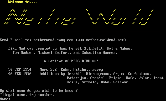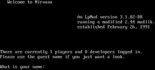 Welcome to Nirvana An LpMud version 3.1.02-DR running a modified 2.44 mudlib. established February 26, 1991 There are currently 1 players and 0 developers logged in. Please use the guest name if you just want a look. What is your name: