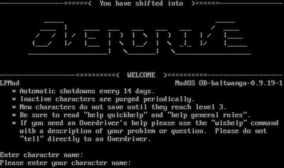 -​---------------======< You have shifted into >=​=====---------------- _​____ _​____ _​___ \| _​___ ___ ___ ___ ___ / _​___ / / \| / \|__ \| ) \| \\ \| ) \| \| / \|_​___ (___/ \|/ \|___ \| \\ \|__/ \| \\ _\|_ \|/ \|_​____ _​___________________\| \\_​______\| \\_​__________________ -​------------------==========< WELCOME >=​=========------------------- LPMud MudOS OD-baltwanga-0.9.19-1 \* Automatic shutdowns every 14 days. \* Inactive characters are purged periodically. \* New characters do not save until they reach level 3. \* Be sure to read "help quickhelp" and "help general rules". \* If you need an Overdriver's help please use the "wizhelp" command with a description of your problem or question. Please do not "tell" directly to an Overdriver. Enter character name: Please enter your character name: