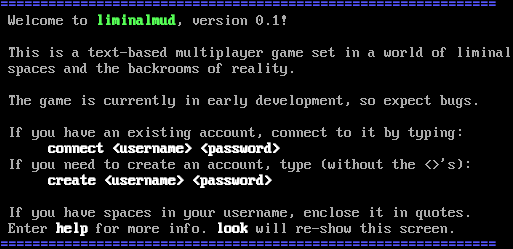 =​============================================================= Welcome to liminalmud, version 0.1! This is a text-based multiplayer game set in a world of liminal spaces and the backrooms of reality. The game is currently in early development, so expect bugs. If you have an existing account, connect to it by typing: connect &lt;username&gt; &lt;password&gt; If you need to create an account, type (without the &lt;&gt;'s): create &lt;username&gt; &lt;password&gt; If you have spaces in your username, enclose it in quotes. Enter help for more info. look will re-show this screen. =​=============================================================