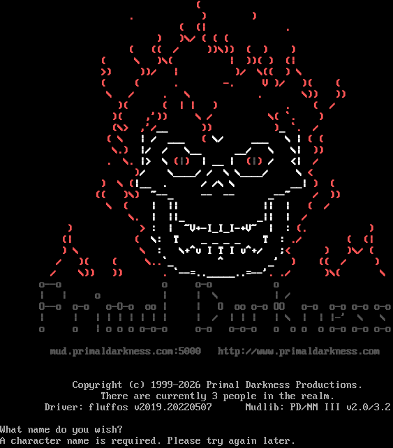 ( . ) ) ( (\| . ) )\\/ ( ( ( ( (( / ))\\)) ( ) ) ( \\ )\\( \| ))( ) (\| >) ))/ \| )/ \\(( ) \\ ( ( . -. V )/ )( ( \\ / . \\ . \\)) )) )( ( \| \| ) . ( / )( ,')) \\ / \\( \`. ) (\\> ,'/__ )) )_ \`. / ( \\ \| / ___ ( \\/ ___ \\ \| ( ( \\.) \|/ / \\__ __/ \\ \\\| )) . \\. \|> \\ (\|) \| __ \| (\|) / <\| / )/ \\_​___/ / \\ \\_​___/ \\ < ) \\ (\|__ . / /\\ \\ __\| ) ( (( )\\) ~​--_ -- -- _​--~ / )) \\ ( \| \|\| \|\| \| ( / \\. \| \|\|_ _\|\| \| / ) > : \| ~V+-I_I_I-+V~ \| : (. ) (\| ( \\: T _ _ _ _ T : ./ ( (\| ) \\ \\ : \\+^v I T I v^+/ ;< ) )\\/ ( / )( ( \\..\`_ ^ _' ) (( / ) / \\)) )) . \`-​-=.._____..=--'. ./ )\\( \\ o--o o o-o o \| \| o \| \| \\ \| / O--o o-o o-O-o oo \| \| O oo o-o OO o-o o-o o-o o-o \| \| \| \| \| \| \| \| \| \| / \| \| \| \| \\ \| \| \|-' \\ \\ o o \| o o o o-o-o o-o o-o-o o o o o o-o o-o o-o mud.primaldarkness.com:5000 http://www.primaldarkness.com Copyright (c) 1999-2026 Primal Darkness Productions. There are currently 3 people in the realm. Driver: fluffos v2019.20220507 Mudlib: PD/NM III v2.0/3.2 What name do you wish? A character name is required. Please try again later.
