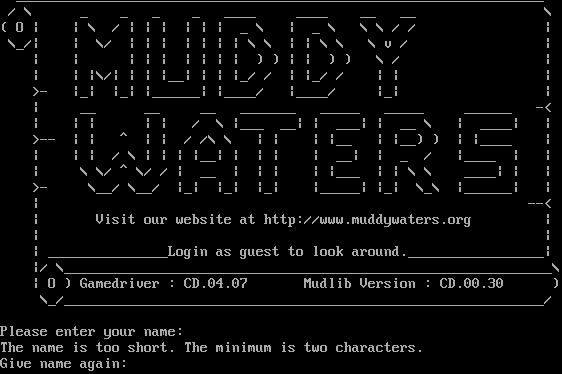 _​_________________________________________________________________ / \\ _ _ _ _ _​___ _​___ __ __ \\ ( O \| \| \\ / \| \| \| \| \| \| _ \\ \| _ \\ \\ \\ / / \| \\_/\| \| \\/ \| \| \| \| \| \| \| \\ \\ \| \| \\ \\ \\ v / \| \| \| \| \| \| \| \| \| \| ) ) \| \| ) ) \\ / \| \| \| \|\\/\| \| \| \|__\| \| \| \|_/ / \| \|_/ / \| \| \| >- \|_\| \|_\| \|_​_____\| \|_​___/ \|_​___/ \|_\| \| \| __ __ __ _​______ _​____ _​____ _​_____ -< \| \| \| \| \| / \\ \|___ __\| \| ___\| \| __ \\ \| _​___\| \| >-- \| \| ^ \| \| / /\\ \\ \| \| \| \|__ \| \|__) ) \| \|_​___ \| \| \| \| / \\ \| \| \| \|__\| \| \| \| \| __\| \| _ / \|_​___ \| \| \| \\ \\/ ^ \\/ / \| __ \| \| \| \| \|___ \| \| \\ \\ _​___\| \| \| >- \\__/ \\__/ \|_\| \|_\| \|_\| \|_​____\| \|_\| \\_\\ \|_​_____\| \| \| --< \| Visit our website at http://www.muddywaters.org \| \| \| \| _​______________Login as guest to look around.​_________________\| \|/ \\_​____________________________________________________________\\ \| O ) Gamedriver : CD.04.07 Mudlib Version : CD.00.30 ) \\_/_​___________________________________________________________/ Please enter your name: The name is too short. The minimum is two characters. Give name again: