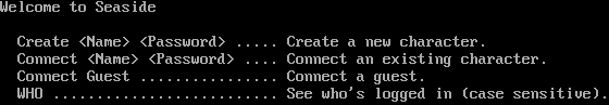 Welcome to Seaside Create <Name> <Password> .​.... Create a new character. Connect <Name> <Password> .​... Connect an existing character. Connect Guest .​............... Connect a guest. WHO .​......................... See who's logged in (case sensitive).