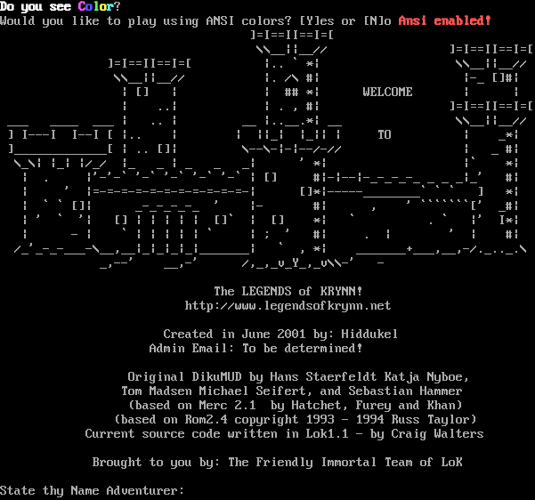 Do you see Color? Would you like to play using ANSI colors? [Y]es or [N]o Ansi enabled! ]=I==II==I=[ \\\\__\|\|__// ]=I==II==I=[ ]=I==II==I=[ \|.. \` \*\| \\\\__\|\|__// \\\\__\|\|__// \|. /\\ #\| \|-_ []#\| \| [] \| \| ## \*\| WELCOME \| \| \| ..\| \| . , #\| ]=I==II==I=[ ___ _​___ ___ \| .. \| __ \|.​.__.\*\| __ \\\\__\|\|__// ] I---I I--I [ \|.. \| \| \|\|_\| \|_\|\| \| TO \| _\*\| ]_​____________[ \| .. []\| \\--\\-\|-\|--/-// \| _ #\| \\_\\\| \|_\| \|/_/ \|_ _ \| _ _ _\| ' \*\| \|\` \*\| \| . \|'-'-\` '-\` '-\` '-\` '-\` \| [] #\|-\|--\|-​_-_-_-_ _ _ _\|_' #\| \| ' \|=​-=-=-=-=-=-=-=-=-=-=-\| []\*\|-​----________\` \` \` ] \*\| \| \` \` []\| _​-_-_-_-_ ' \|- #\| , ' \`\`\`\`\`\`\`[' _#\| \| ' \` '\| [] \| \| \| \| \| []\` \| [] \*\| \` . \` \|' I\*\| \| - \| \` \| \| \| \| \| \` \| ; ' #\| . \| ' \| #\| /_'_​-_-___-\\__,__\|_\|_\|_\|_\|_​______\| \` , \*\| _​______+___,__,-/.​_.._.\\ _,--' __,-' /,_,_v_Y_,_v\\\\-' - The LEGENDS of KRYNN! http://www.legendsofkrynn.net Created in June 2001 by: Hiddukel Admin Email: To be determined! Original DikuMUD by Hans Staerfeldt Katja Nyboe, Tom Madsen Michael Seifert, and Sebastian Hammer (based on Merc 2.1 by Hatchet, Furey and Khan) (based on Rom2.4 copyright 1993 - 1994 Russ Taylor) Current source code written in Lok1.1 - by Craig Walters Brought to you by: The Friendly Immortal Team of LoK State thy Name Adventurer: