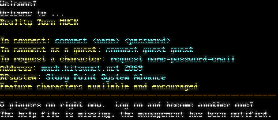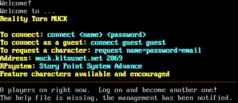 Welcome! Welcome to ... Reality Torn MUCK To connect: connect <name> <password> To connect as a guest: connect guest guest To request a character: request name=password=email Address: muck.kitsunet.net 2069 RPsystem: Story Point System Advance Feature characters available and encouraged -​----------------------------------------------------------- 0 players on right now. Log on and become another one! The help file is missing, the management has been notified.