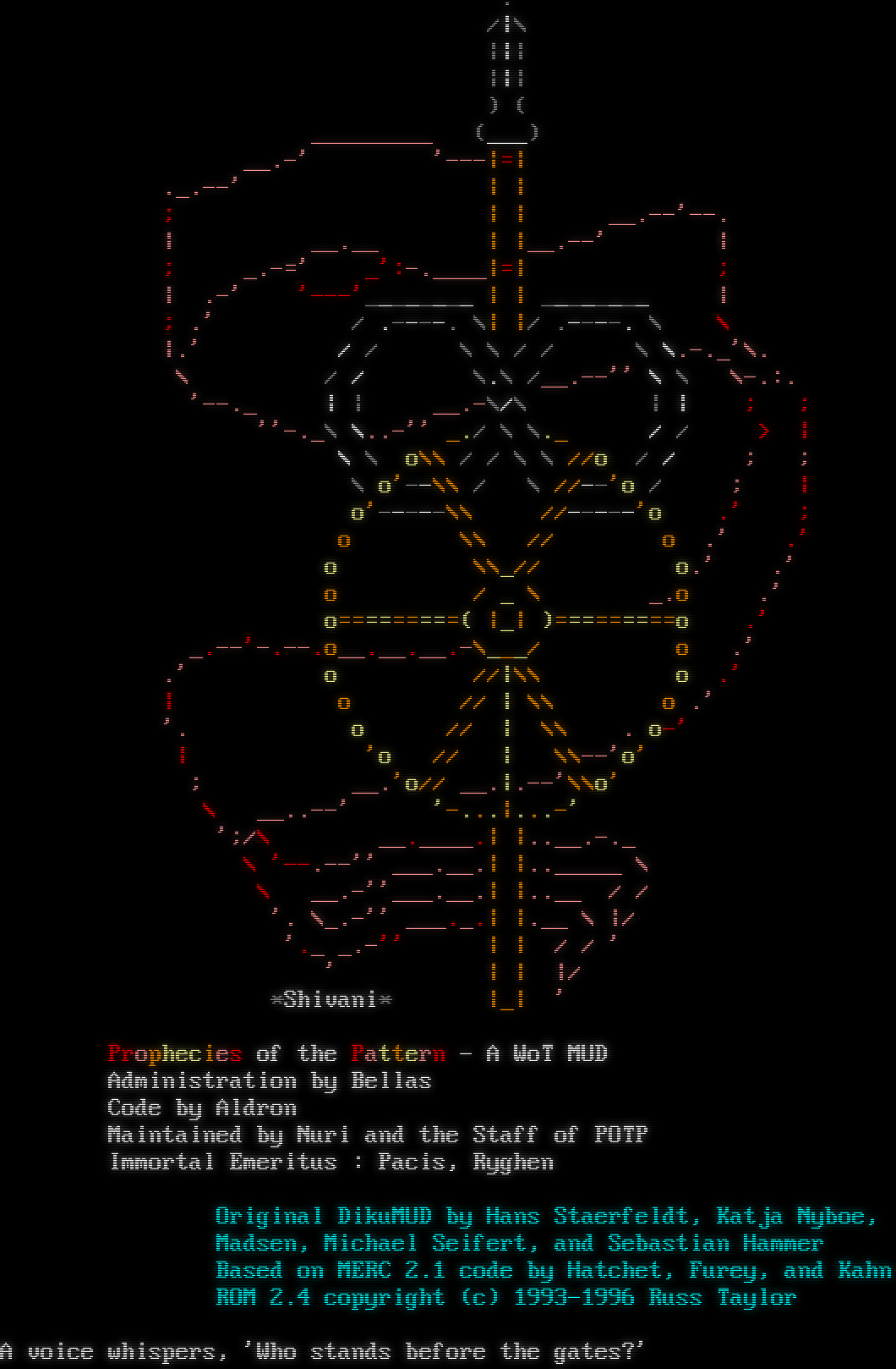 . /\|\\ \|\|\| \|\|\| ) ( _​________ (___) _​_.-' '---\|=\| .​_.--' \| \| ; \| \| _​_.--'--. \| _​_.__ \| \|_​_.--' \| ; _​.-=' _':-​.____\|=\| ; \| .-' '---'_​_______ \| \| _​_______ \| ; .' / .​----. \\\| \|/ .​----. \\ \\ \|.' / / \\ \\ / / \\ \\.​-._'\\. \\ / / \\.\\ /_​_.--'' \\ \\ \\-.:. '-​-._ \| \| _​_.-\\/\\ \| \| ; ; ''-._\\ \\..-'' _./ \\ \\._ / / > \| \\ \\ o\\\\ / / \\ \\ //o / / ; ; \\ o'--\\\\ / \\ //--'o / ; \| o'-​----\\\\ //-​----'o .' ; o \\\\ // o .' .' o \\\\_// o.' .' o / _ \\ _.o .' o=​========( \|_\| )=​========o .' _​.--'-​.--.o_​_.__.__.-\\___/ o .' .' o //\|\\\\ o .' \| o // \| \\\\ o .' '. o // \| \\\\ . o-' \| 'o // \| \\\\--'o' ; __.'o// __.\|.--'\\\\o' \\ _​_..--' '-​...\|.​..-' ';/\\ _​_.____.\| \|.​.__.-._ \\ '-​-.--'' _​__.__.\| \|.​._____ \\ \\ _​_.-''_​__.__.\| \|.​.__ / / '. \\_.-'' _​__._.\| \|.__ \\ \|/ '._ _.-'' \| \| / / ' ' \| \| \|/ \*Shivani\* \|_\| ' Prophecies of the Pattern - A WoT MUD Administration by Bellas Code by Aldron Maintained by Nuri and the Staff of POTP Immortal Emeritus : Pacis, Ryghen Original DikuMUD by Hans Staerfeldt, Katja Nyboe, Madsen, Michael Seifert, and Sebastian Hammer Based on MERC 2.1 code by Hatchet, Furey, and Kahn ROM 2.4 copyright (c) 1993-1996 Russ Taylor A voice whispers, 'Who stands before the gates?'
