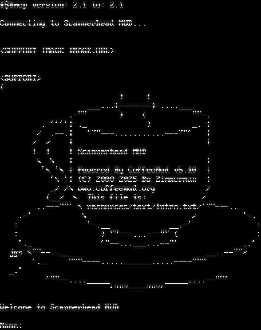 #$#mcp version: 2.1 to: 2.1 Connecting to Scannerhead MUD... <SUPPORT IMAGE IMAGE.URL> <SUPPORT> ( ) ( _​__...(-​------)-​....___ .-&quot;&quot; ) ( &quot;&quot;-. .-''''\|-._ ) _.-\| / .​--.\| '&quot;&quot;-​--...........---&quot;&quot;' \| / / \| \| \| \| \| Scannerhead MUD \\ \\ \| \| '\\ '\\ \| Powered By CoffeeMud v5.10 \| '\\ '\| (C) 2000-2025 Bo Zimmerman \| _/ /\\ www.coffeemud.org / (__/ \\ This file is: / _​..---&quot;&quot;' \\ resources/text/intro.txt/'&quot;&quot;-​--.._ .-' \\ / '-. : '-​.__ _​_.-' : : ) &quot;&quot;-​--...---&quot;&quot; ( : '._ '&quot;-​-...___...--&quot;' _.' jgs \\&quot;&quot;-​-..__ _​_..--&quot;&quot;/ '._ &quot;&quot;&quot;-​---.....______.....----&quot;&quot;&quot; _.' '&quot;&quot;-​-..,,_​____ _​____,,.​.--&quot;&quot;' '&quot;&quot;&quot;-​---&quot;&quot;&quot;' Welcome to Scannerhead MUD Name: