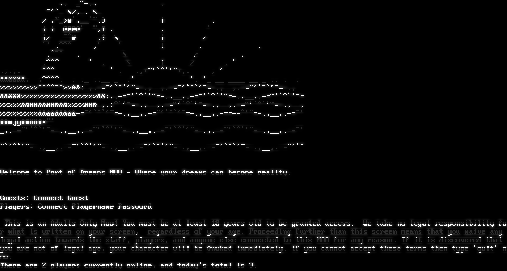,. _​~-., . ~'\`_ \\/,_. \\_ / ,"_>@\`,__\`~.) \| . \| \| @@@@' ",! . . ' \|/ ^^@ .! \\ \| / \`' .​^^^ ,' ' \| . . .​^^^ . \\ / . .​^^^ ' . \\ \| / . ' .,.,. ^^^ \` . .,+~'\`^\`'~+,. , ' &&&&&&, ,^​^^^. . ._ .​.__ _ .' '. '_ __ _​___ __ _ .. . . %%%%%%%%%^​^^^^^%%&&;_,.​-=~'\`^\`'~​=-.,__,.​-=~'\`^\`'~​=-.,__,.​-=~'\`^\`'~​=-., &&&&&%%%%%%%%%%%%%%%%%%&&;,.​-=~'\`^\`'~​=-.,__,.​-=~'\`^\`'~​=-.,__,.​-=~'\`^\`'~= %%%%%&&&&&&&&&&&%%%%&&&_,.;^\`'~​=-.,__,.​-=~'\`^\`'~​=-.,__,.​-=~'\`^\`'~​=-.,__, %%%%%%%%%&&&&&&&&&-=~'\`^\`'~​=-.,__,.​-=~'\`^\`'~​=-.,__,.​-==--^'~​=-.,__,.​-=~' ##mjy#​####\*"' _,.​-=~'\`^\`'~​=-.,__,.​-=~'\`^\`'~​=-.,__,.​-=~'\`^\`'~​=-.,.​-=~'\`^\`'~​=-.,__,.​-=~' ~\`'^\`'~​=-.,__,.​-=~'\`^\`'~​=-.,__,.​-=~'\`^\`'~​=-.,__,.​-=~'\`^\`'~​=-.,__,.​-=~'\`^ Welcome to Port of Dreams MOO - Where your dreams can become reality. Guests: Connect Guest Players: Connect Playername Password This is an Adults Only Moo! You must be at least 18 years old to be granted access. We take no legal responsibility for what is written on your screen, regardless of your age. Proceeding further than this screen means that you waive any legal action towards the staff, players, and anyone else connected to this MOO for any reason. If it is discovered that you are not of legal age, your character will be @nuked immediately. If you cannot accept these terms then type 'quit' now. There are 2 players currently online, and today's total is 3.