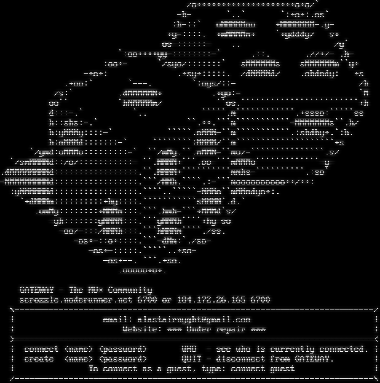 /o+​+++++++++++++++++++o+o/\` -h- \`..\` \`:+o+:.os\` :h-::\` oNMMMMmo +MMMMMMM-.y- +y-::::. +mMMMMm+ \`+ydddy/ s+ os-::::::- .. /y\` \`:oo+​+++yy-::::::::-\` .::. .//+/- .h- :oo+- \`/syo/:::::::\` sMMMMMMs sMMMMMMm\`\`y+ -+o+: .+sy+:::::. /dNMMNd/ .ohdmdy: +s .+oo:\` \`-​--. \`:oys/::- /h /s:\` .dMMMMMN+ .+yo:- \`M oo\`\` \`hNMMMMm/ \`\`os.\`\`\`\`\`\`\`\`\`\`\`\`\`\`\`\`\`\`\`\`\`\`\`\`+h d:::-.\` \`.. \`\`\`\`\`.m\`\`\`\`\`\`\`\`\`\`\`\`.+ssso:\`\`\`\`\`ss h::shs:-.\` \`\`.​++.\`\`\`m\`\`\`\`\`\`\`\`\`\`\`-MMMMMMMs\`\`.h/ h:yMMMy::::-\` \`\`\`\`\`.mMMN-\`\`m\`\`\`\`\`\`\`\`\`\`\`.:shdhy+.\`:h. h:mMMMd:::::::-\` \`\`\`\`\`\`\`\`:MMMM/\`\`m\`\`\`\`\`\`\`\`\`\`\`\`\`\`\`\`\`\`\`\`+s \`/ymd:oMMMo:::::::::-\` \`\`/mNy.\`\`.mMMN-\`\`mo/-\`\`\`\`\`\`\`\`\`\`\`\`\`\`\`.s/ \`/smMMMMd::/o/:::::::::::- \`\`.NMMM+\`\`\`.oo-\`\`\`mMMMo\`\`\`\`\`\`\`\`\`\`\`\`\`-y- .dMMMMMMMMd:::::::::::::::::.\`\`.NMMM+\`\`\`\`\`\`\`\`\`\`mmhs-\`\`\`\`\`\`\`\`\`\`.:so\` -NMMMMMMMMd:::::::::::::::::.\`\`\`/NMh.\`\`\`\`.:-\`\`\`moooooooooo++/++: :yNMMMMMd:::::::::::::::::.\`\`\`\`..\`\`\`\`\`-NMMo\`\`mMMmdyo+:. \`+dMMMm::::::::::+hy::::.\`\`\`\`\`\`\`\`\`\`\`sMMMN\`.d.\` .omMy::::::::+MMMm:::.\`\`\`.hmh-\`\`\`+MMMd\`s/ -yh:::::::yMMMM:::.\`\`\`yMMMh\`\`\`\`+hy-so -oo/-:::/NMMh:::.\`\`\`hMMMm\`\`\`\`./ss. -os+-::o+::::.\`\`\`-dMm:\`./so- -os+-:::::.\`\`\`\`\`..+so- -os+​--. \`\`\`.+so. .ooooo+o+. GATEWAY - The MU\* Community scrozzle.noderunner.net 6700 or 184.172.26.165 6700 \\-​------------------------------------------------------------------------/ \| email: alastairnyght@gmail.com \| \| Website: \*\*\* Under repair \*\*\* \| >-​------------------------------------------------------------------------< \| connect <name> <password> WHO - see who is currently connected. \| \| create <name> <password> QUIT - disconnect from GATEWAY. \| \| To connect as a guest, type: connect guest \| /-​------------------------------------------------------------------------\\