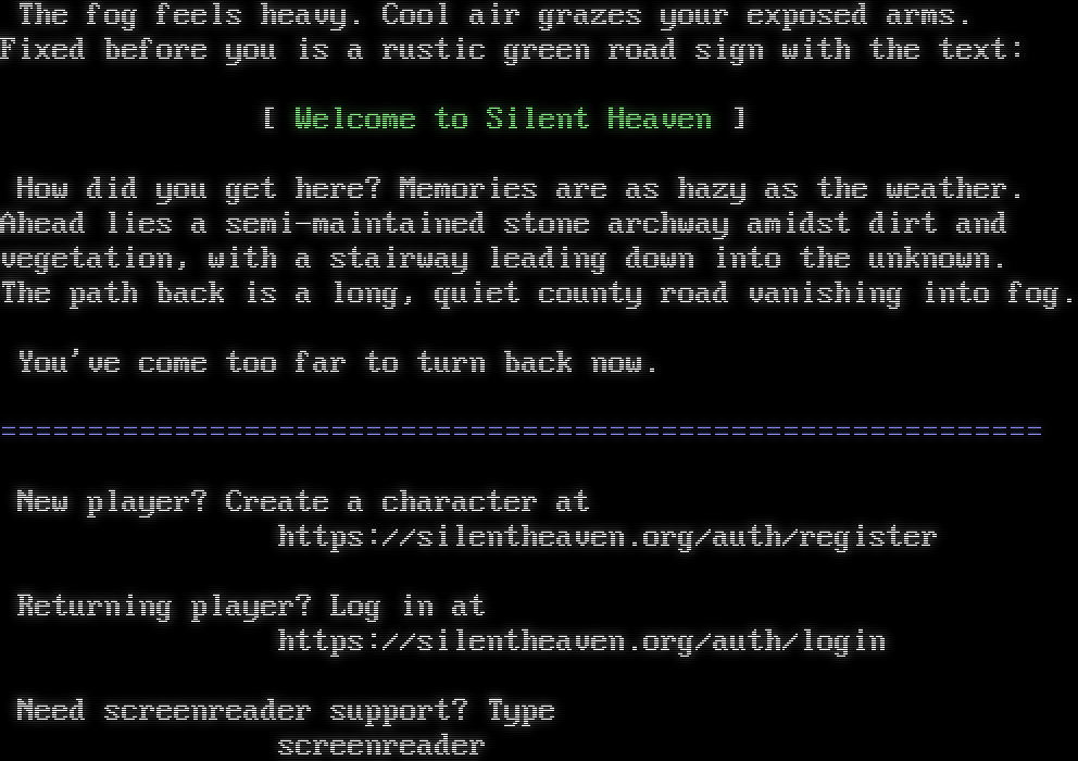 The fog feels heavy. Cool air grazes your exposed arms. Fixed before you is a rustic green road sign with the text: [ Welcome to Silent Heaven ] How did you get here? Memories are as hazy as the weather. Ahead lies a semi-maintained stone archway amidst dirt and vegetation, with a stairway leading down into the unknown. The path back is a long, quiet county road vanishing into fog. You've come too far to turn back now. =​=========================================================== New player? Create a character at https://silentheaven.org/auth/register Returning player? Log in at https://silentheaven.org/auth/login Need screenreader support? Type screenreader