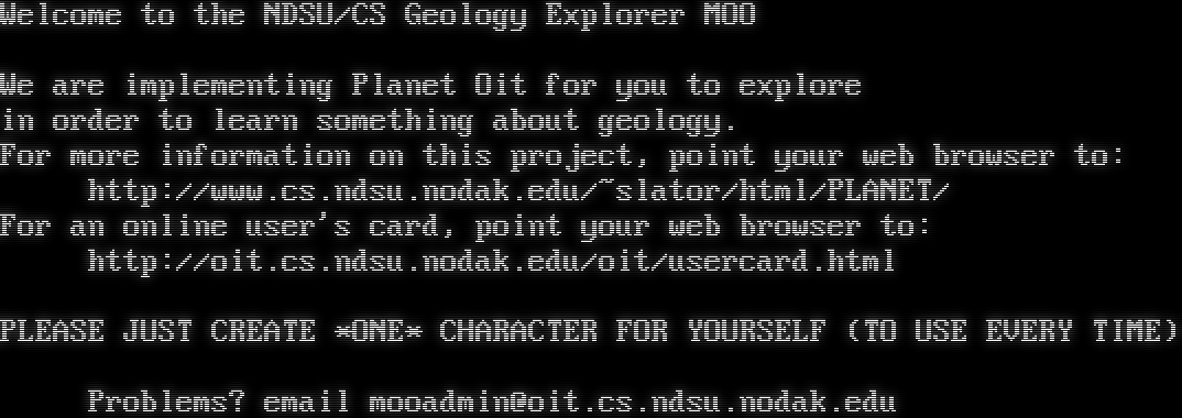 Welcome to the NDSU/CS Geology Explorer MOO We are implementing Planet Oit for you to explore in order to learn something about geology. For more information on this project, point your web browser to: http://www.cs.ndsu.nodak.edu/~slator/html/PLANET/ For an online user's card, point your web browser to: http://oit.cs.ndsu.nodak.edu/oit/usercard.html PLEASE JUST CREATE \*ONE\* CHARACTER FOR YOURSELF (TO USE EVERY TIME) Problems? email mooadmin@oit.cs.ndsu.nodak.edu